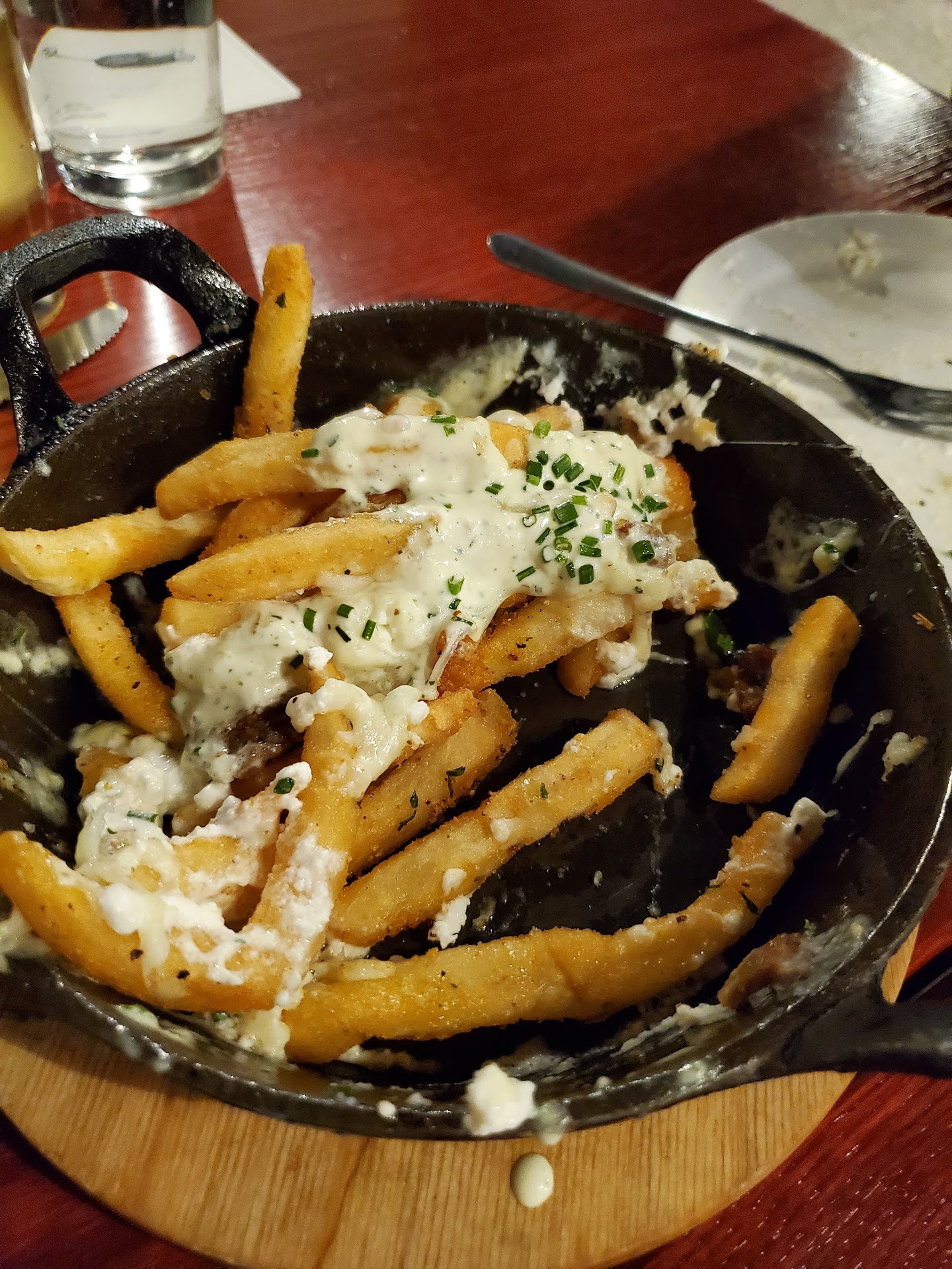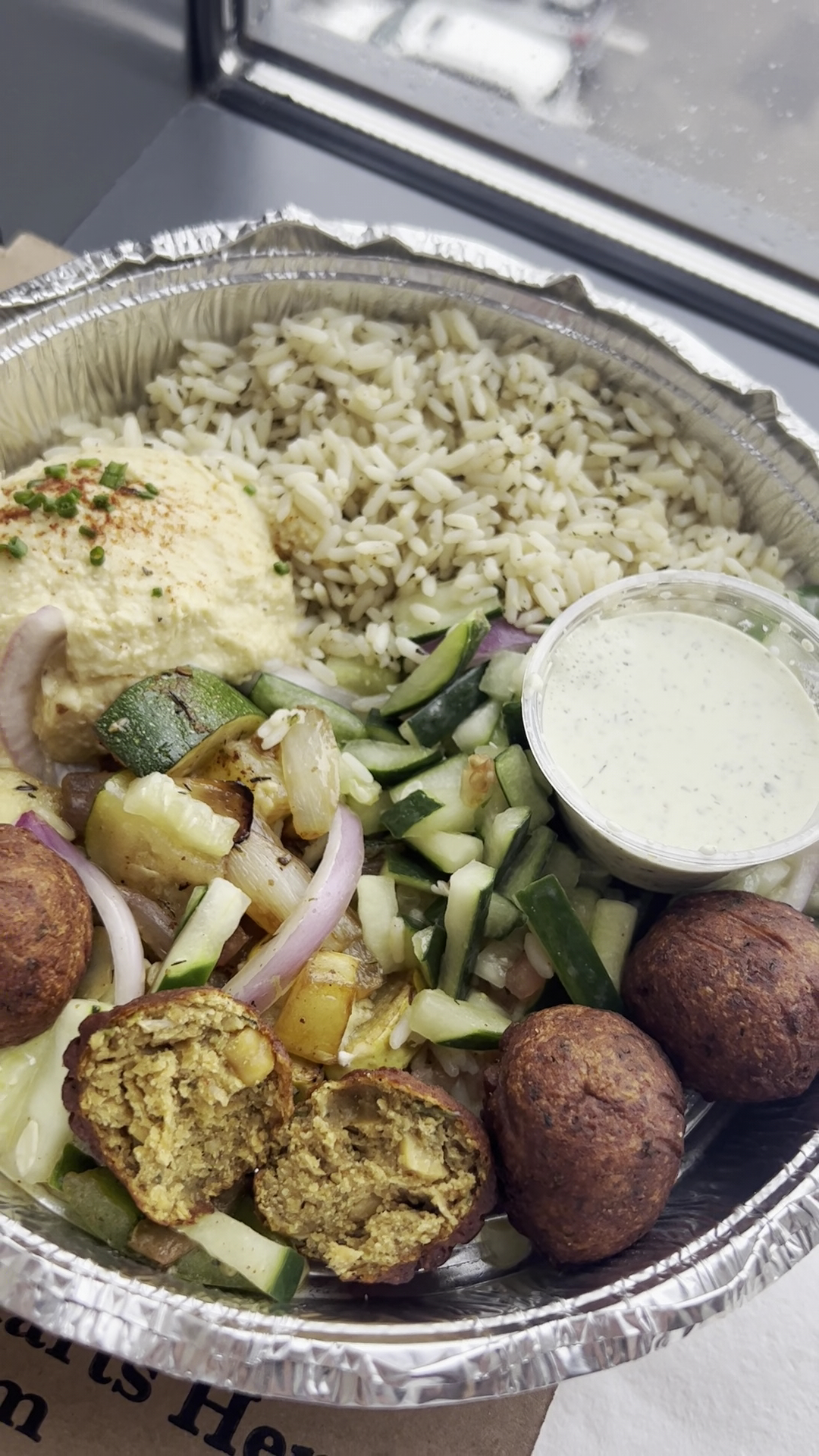 For the food: it was good, my 1 star loss is due to the GF options. As my wife's tastes play a part in my enjoyment it knocked it down. If you're looking for a donner or gyro replacement and you are GF then I'd suggest avoiding the disappointment that is the GF wrap. It was not flavorfull or fluffy. More akin to an over cooked flour tortilla. At $5, it feels like a let down for the above average cost of a GF alternative. My wife found the meat (lamb and beef) for fiery feta gyro to be somewhat grainy. The falafal was solid and some of the better I've hand but a let down alternative to fries definitely. As for my cheesecake and can't stop fries. They were delicious, great flavor in the meat (lamb and beef) with a great amount of sauce for additional flavor. The tzatziki was great. I think I'd ask for additional veggies for variety next time. It was positively filled with meat and sauteed veggies but something fresh would go a long way for this sandwich. I would recommend the kitchen get a good cracker or some other GF alternative to go with the dips or food. Do some crostini or something using wealthy streets GF bread options.
