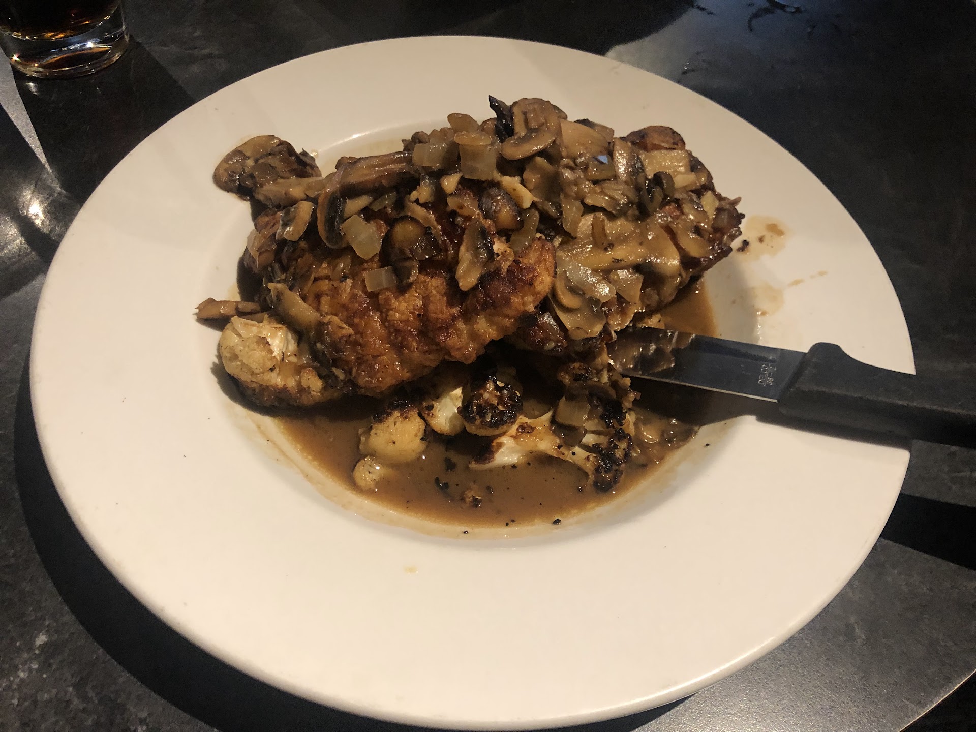 Juliet and I decide to keep it simple tonight, with a single appetizer and mains. The Buffalo Chicken Rolls look promising, though I’m a little wary of deep fried foods these days. To my surprise, the app is like three giant egg rolls, split at an angle so the interior is exposed. Bright orange buffalo chicken meat has been topped with melty cheddar jack. The rolls sit on bleu cheese sauce and are sprinkled with scallion bits, but also some clever shards of celery. It’s got a little kick, but not too much. All of the components are well-balanced. The celery adds a crisp, clean punch and the eggroll is not too greasy or crunchy. This is probably one of the best appetizers I’ve ever had. Simply put: great.