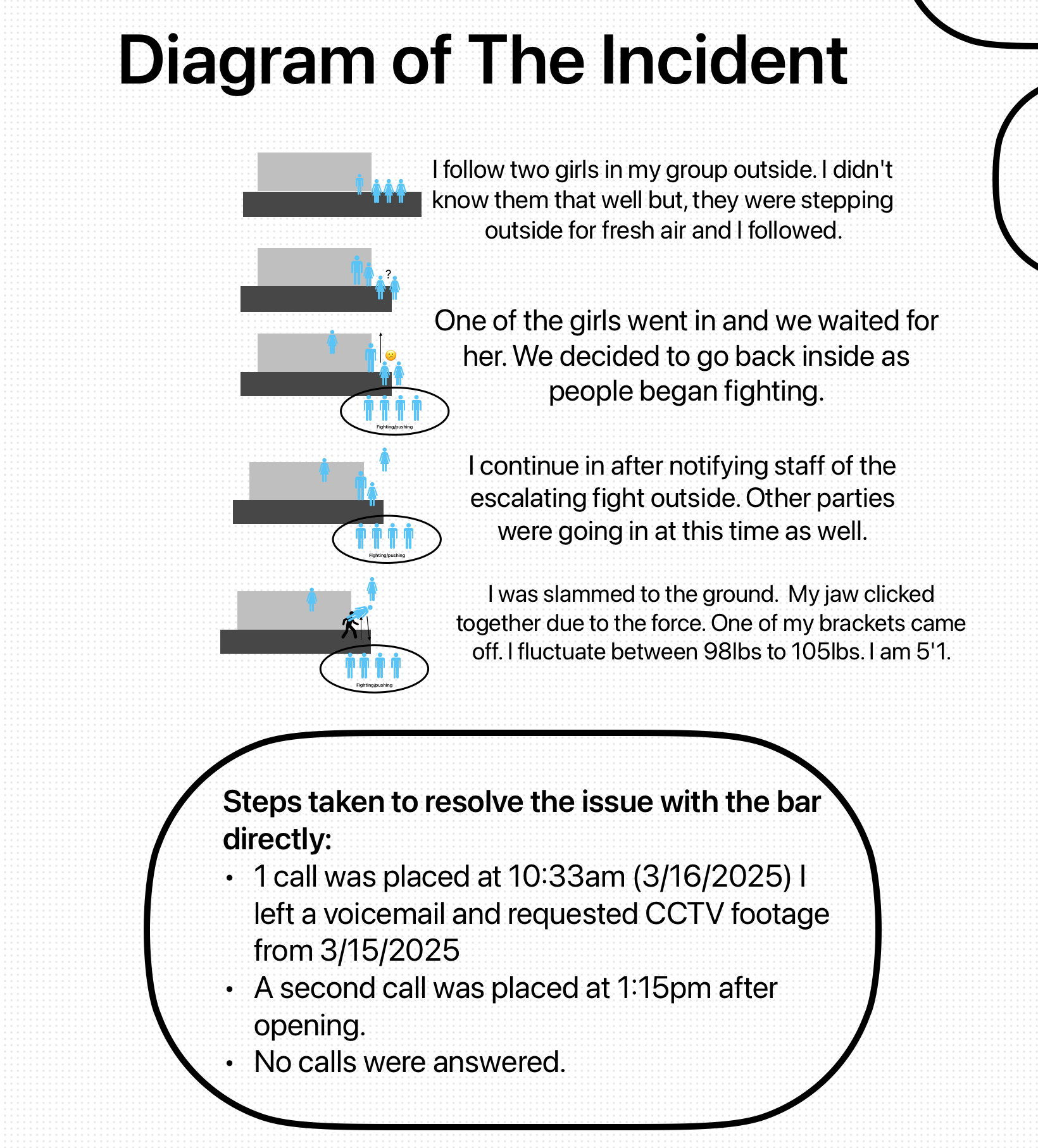 4/3/2025: As the investigation is stalled, I DID choose to post about my experience— after being told not to. The bar blocked me.