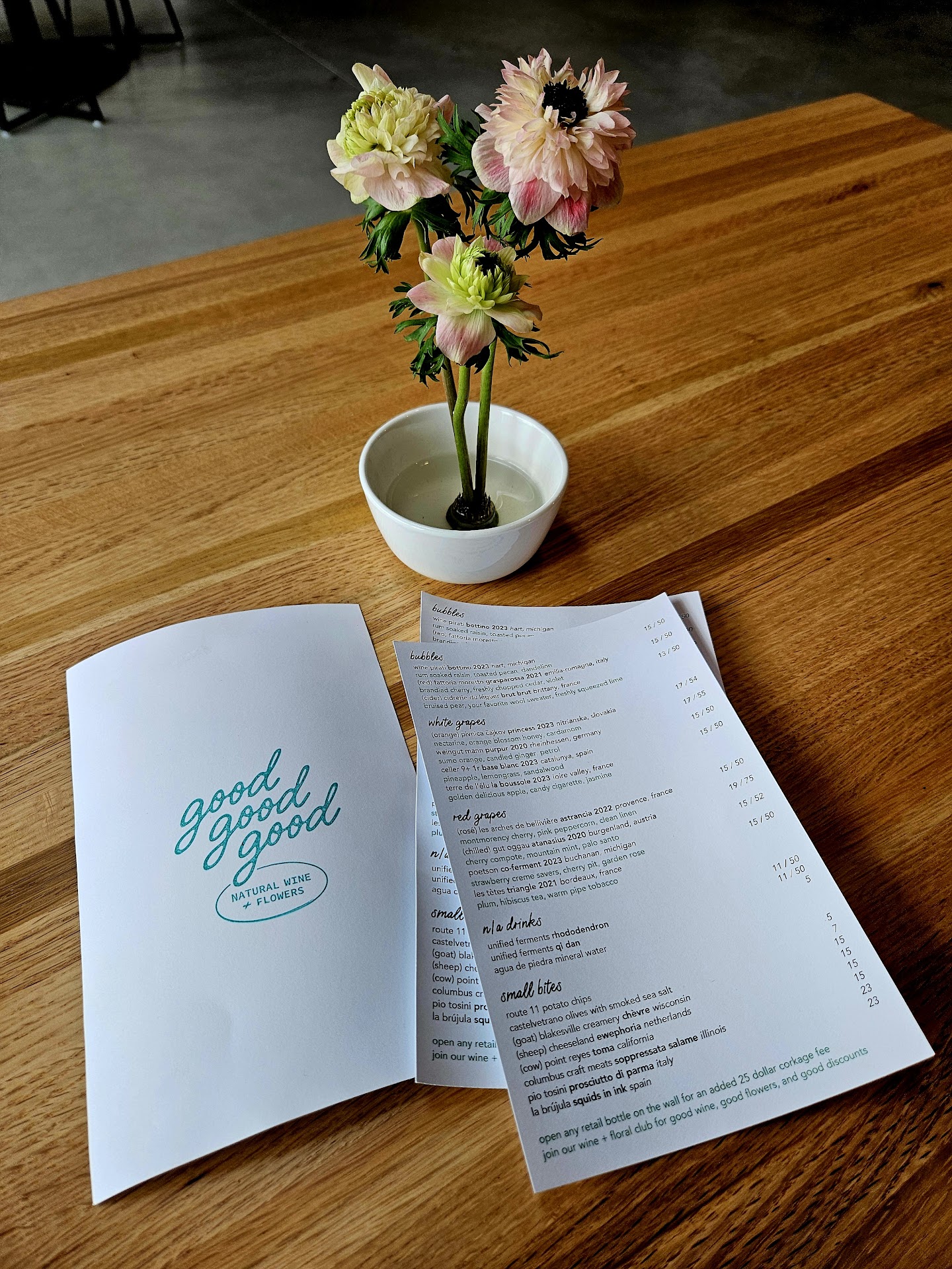 But, I digress. Good Good Good is notable not only for its wine and flowers—the two categories in which it explicitly pursues excellence—but for the passion which seeps out of its every pore. The service/retail markets are oversaturated with names, attitudes, and designs that leap from spreadsheets and not from any love of craft or human decency. What Jon, Sam, and Kyle have accomplished here is an act of consideration for themselves and their community. Good Good Good is only now producing the fruits its founder have been planting for years with their dedication to the people and places...