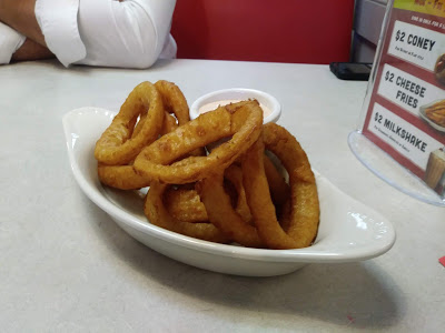 My eyes are immediately drawn to the unique style of dish that the onion rings arrive in. They are a cut above the plain white plate, and of an entirely different character than the plastic baskets lined with a modicum of greasy waxed paper. It is oblong and mysterious, not unlike an albino, open-faced banana peel.
