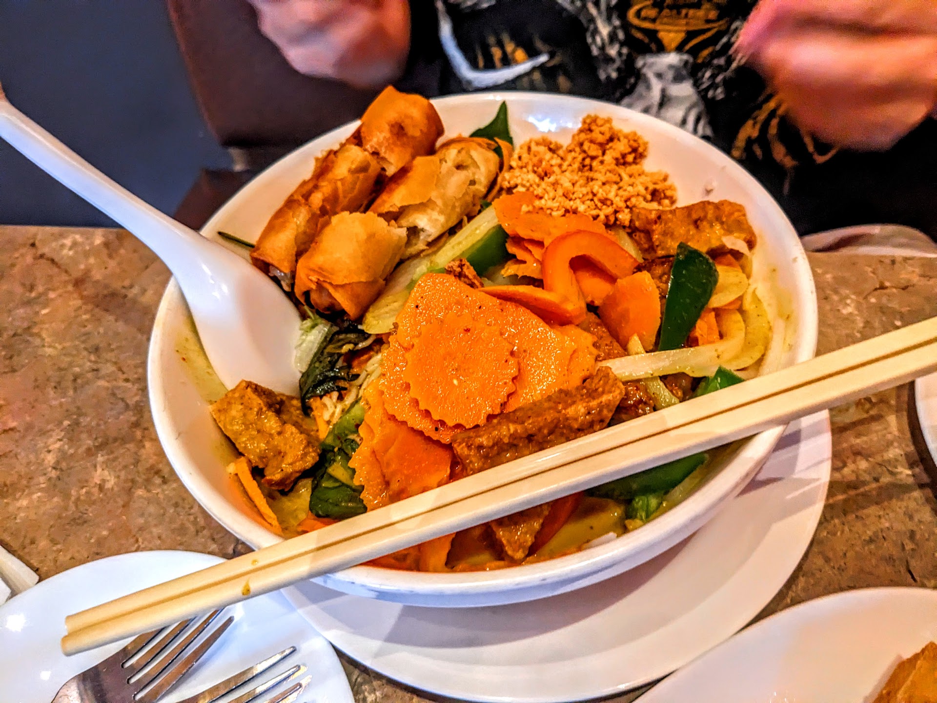 Then I remembered Lai Thai--I'd eaten there before and I love that place--super friendly owner and staff, and wonderful, fresh food. I drove across town. I walk in and the little place is full, bustling, it's lunchtime, and there is a THAI BUFFET! This seemed like a miracle. The air was steamy and smelled so wonderful. People were talking, happy, eating wonderful food. The lovely young woman at the counter was so friendly. There were vegan EGG ROLLS! Half the dishes were vegan! I think my eyes filled with tears. I think bird song filled the air. I filled a take out container with the most gorgeous Thai dishes I have ever seen. Lunch was delicious. I paid less than $10 for this little bit of...