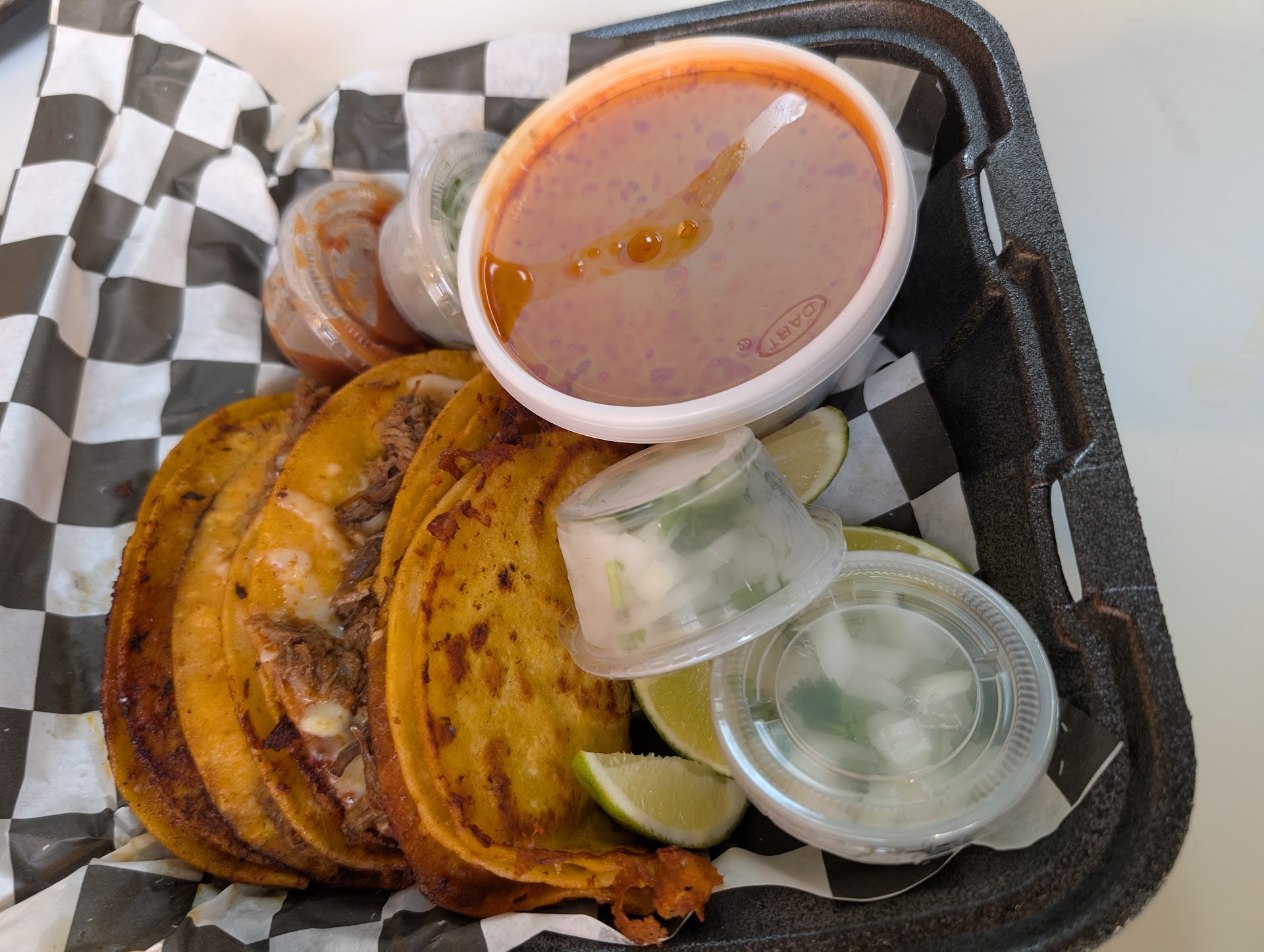 Stopped in here for dinner with my wife and both of us ordered the quesabirria plate with extra onion and cilantro. Comes with 4 quesabirria tacos, broth, and hot sauce. The place is very small with only two small tables to dine in at but we got lucky and got one, so we ate it there. We fully anticipated to take it to go and will definitely do that next time. It's Friday night at dinner time so we waited ~25 minutes for our food and they were up front about the wait when we ordered...it was well worth the wait! The meal was fantastic. We really enjoyed it. Was hot, fresh and very flavorful. Service was great. Only downside is we did not see a bathroom available for eat in guests. Parking situation is tough when they are busy but we made it work by parking on Leonard street. Most people were taking to go so I'm sure if you waited a minute or two you could get a spot in the small awkward lot east of the building. They also had two picnic tables available to eat outside if you choose. They have several other menu items I would love to try; but if you love Birria give this place a try - you won't be...
