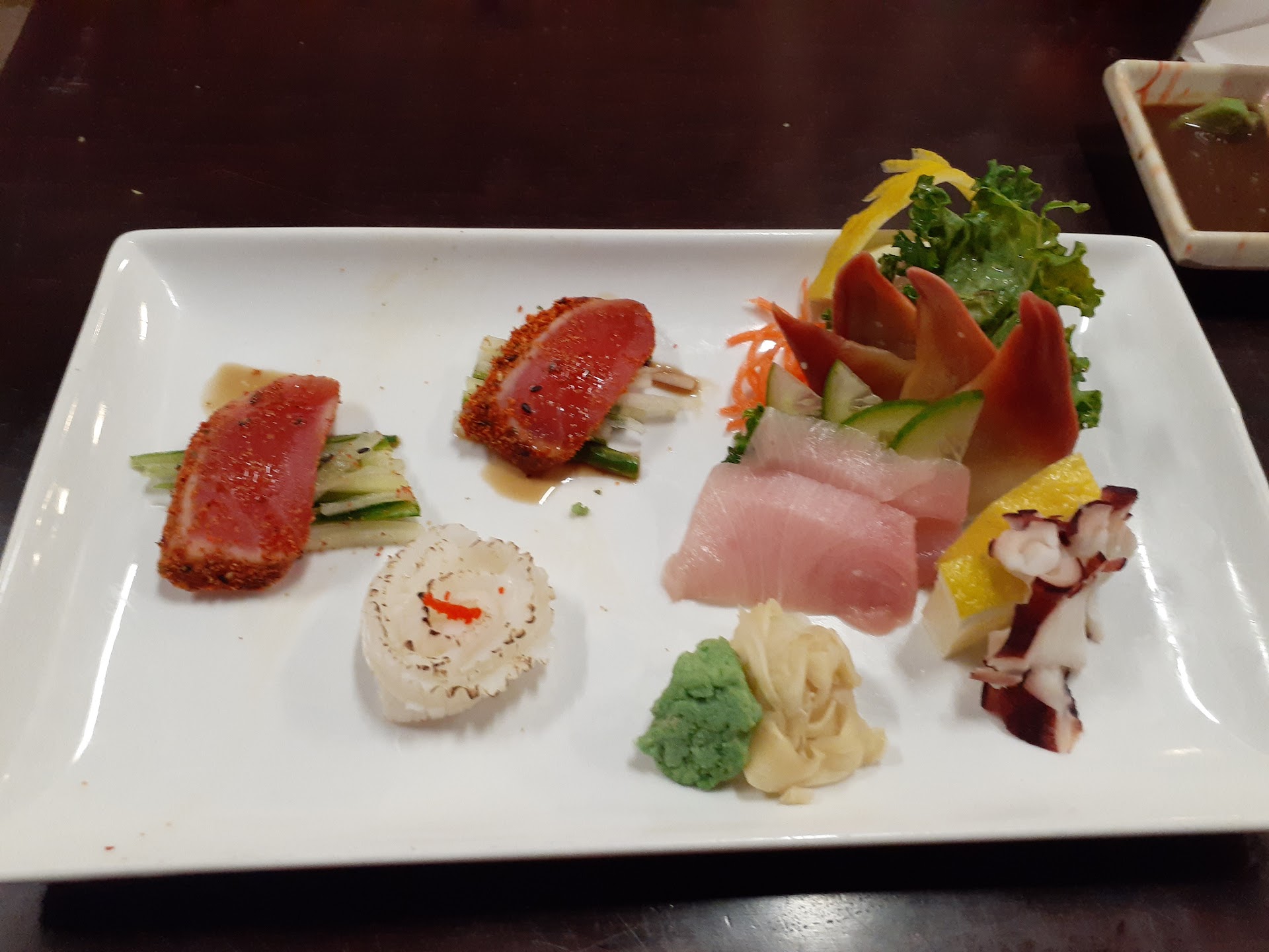The sashimi was really nice and some interesting cuts. I am used to things like the surf clams being whole but these were thin sliced in half. The squid was sliced SUPER thin and rolled beautifully. The spicy crusted tuna was fantastic as well.