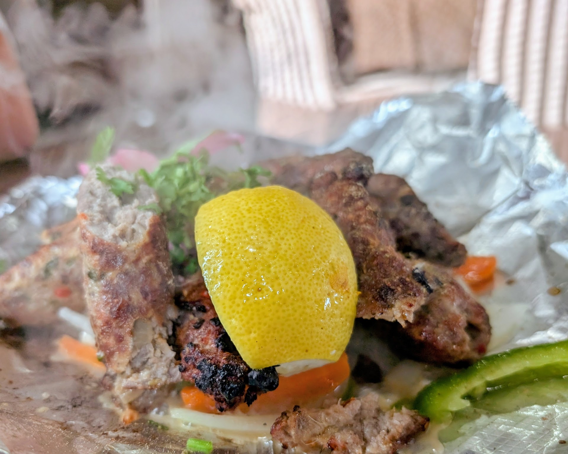 Lamb Seekh Kabob: It is like sausage, but fresher, spiced differently, and has a dryer texture. It was served on a sizzler like cast iron platter with onions, green peppers, carrots, and a slice of lemon. It also came with white rice.