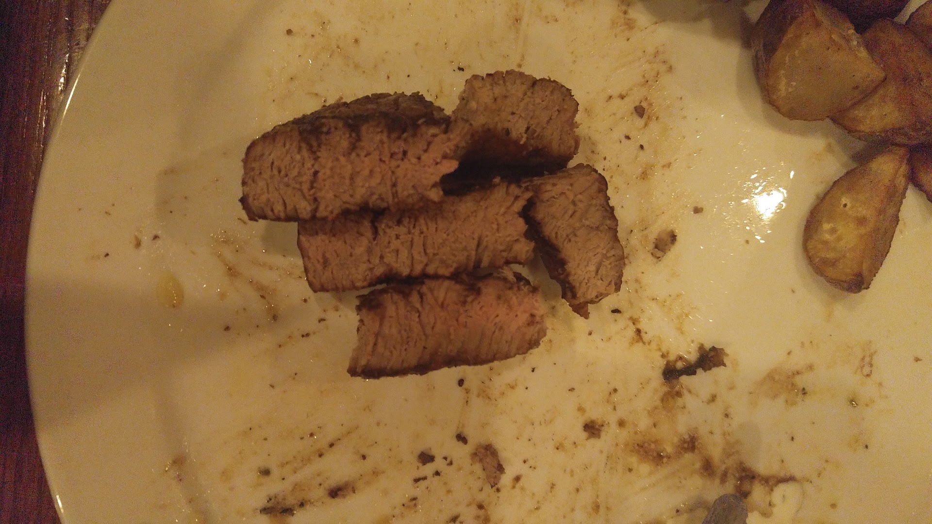 Read moreI'm giving a three, based on my experience. But that is not true for the rest of my group, most of whom would rate a 1 star. I would not recommend this place for large parties. We booked a back room in advance. When I got there I was impressed to see printed menus especially for us. What I did not really like was those menus had four options as to what we could order. Lasagna, steak, chicken, tilapia. Top of the menu said salad and bread is included. Sat for a solid half hour after getting drinks before getting bread. Told when ordering entrées salad is not included, it's a $3 charge. Alright. Least they told us, even though the menu they printed for us said otherwise. One of the other tables at my party was not told this so they got a surprise on their bills. I ordered a steak. Rare. I repeated, really rare. Attached picture is some cut pieces of the steak. Charred on one side and closer to medium well than rare, but I didn't have time to send it back . Veggies and potatoes were good though. The waitress at my table was lovely and I regret not catching her name to compliment her. The waitress at one of our other tables was not so great. As I was leaving I heard her come up to the table, which already was unhappy being charged for the salad, and "apologize" for not being attentive, because she had other tables and was busy. She may have meant well but came off very defensive. That transitioned to aggressive after some back and forth. Ended up talking to the manager getting his meal comped because of service, low quality of food off an already limited menu, and the issue with not being told the salad was extra. Overall, maybe good for families, but not for groups. And judging by the treatment we received after bringing issues to management, we will not be returning. Food ** Service ** for me, * for others Atmosphere *...