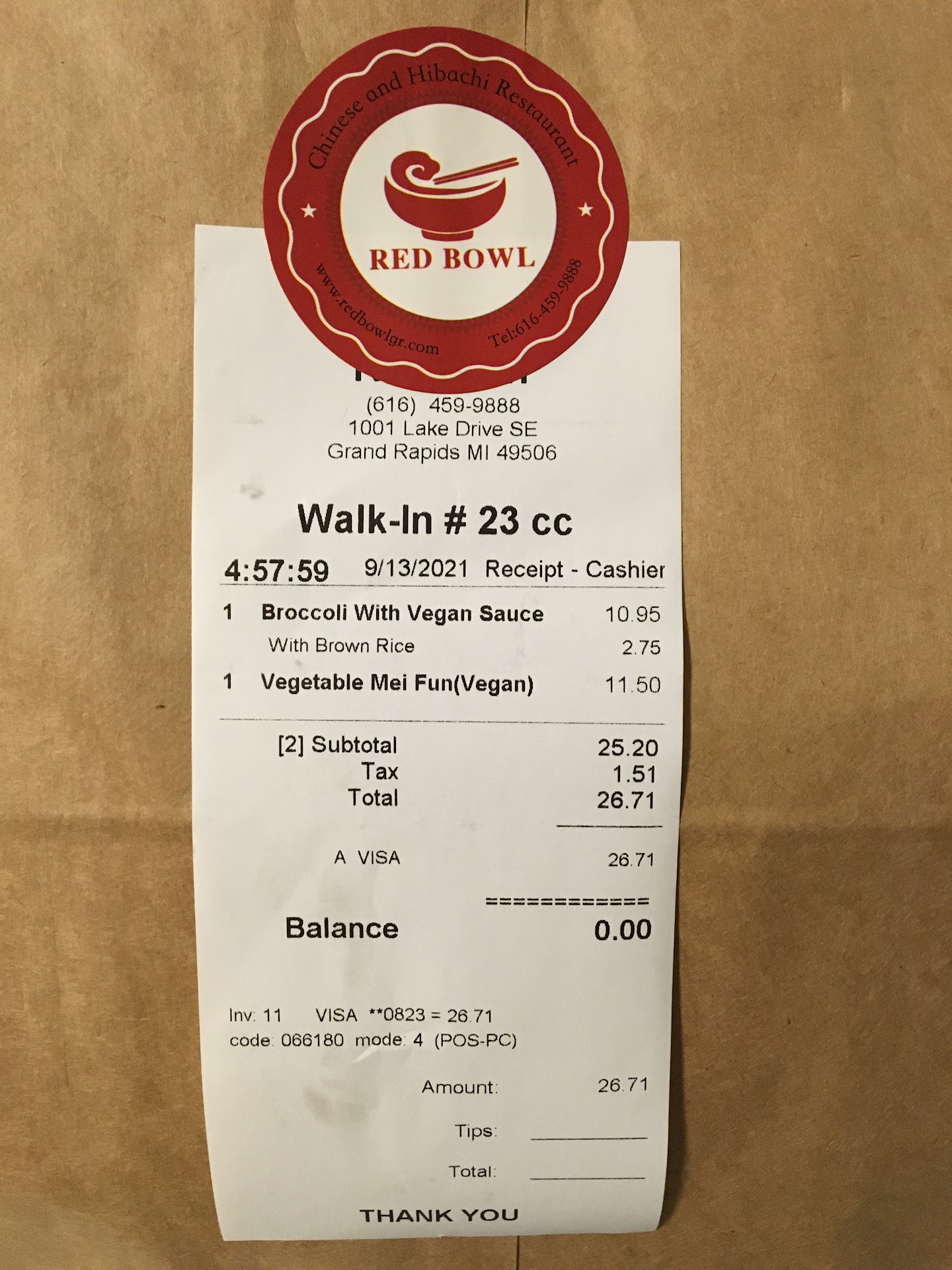 Read moreI am always in the mood for Chinese takeout. Red Bowl is pretty good. Have ordered takeout from here 3 or so times within the past year. Here are my takeaways: orange chicken is solid - good meat to breading ratio and has a good flavor with a bit of spice. Sesame chicken has great flavor, not too sweet. Fried rice isn't my favorite - I like the larger chunks of onion but there is a bit of old pan flavor to the rice, if that makes sense... I typically opt for white rice but the fried isn't the worst I've had. Rangoon is above average comparatively for GR - good amount of crab cheese filling and the flavor is great. Overall, 4 stars. If the fried rice was better I would have given 5. It's your standard Chinese takeout joint with competitive pricing (lunch special...