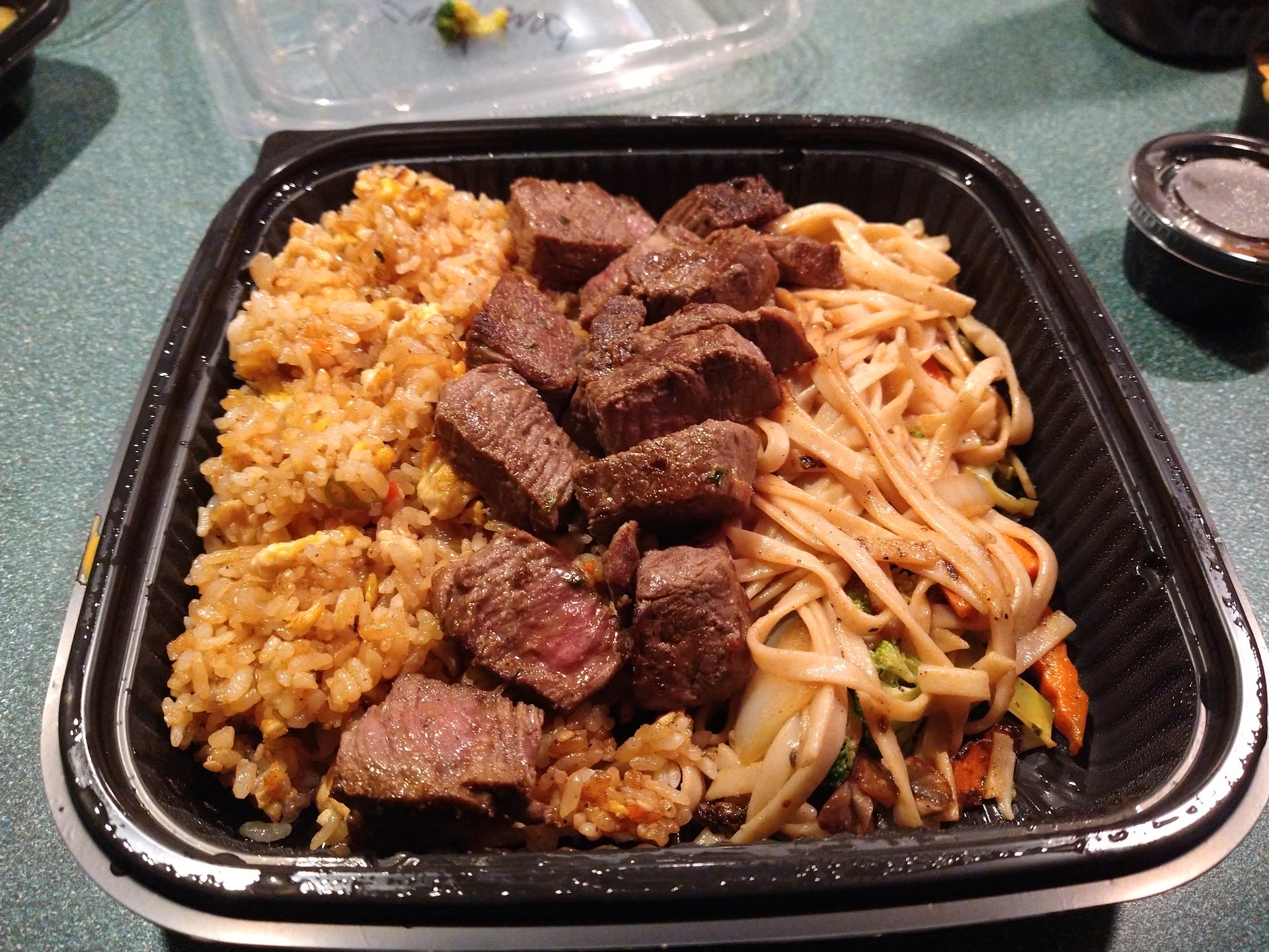 All this was served in take-out containers and our utensils were plastic. I was thankful for the fact the spoon and fork were separate rather than the more economical spork. There was something odd about the spoon, though. It seemed small and did not work well for eating soup. We drank our soup and ate the solids, sparse as they were, with our forks. I did expect better utensils with a $29.00 meal. If I were to come back, which I won't, I'd bring my own silverware. Plastic forks, knives, and spoons at an establishment that bills itself as a "Japanese Steakhouse" was... unexpected and disappointing.