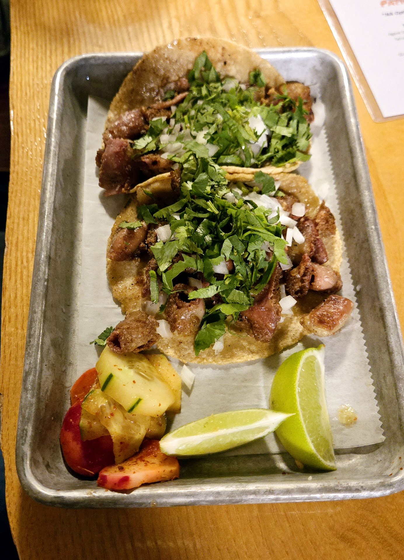 The guy was incredibly friendly and kindly explained a few of the taco options I didn't know. He recommended the cecina con papas (a type of beef with potatoes) and nopales en vinagre (pickled cactus) tacos. These turned out to be terrific recommendations. The pickled cactus was different and delicious and the cecina con papas!!!!!!!! It was insanely delicious. The food, paired with friendliness and casualness of the setting will definitely bring me...