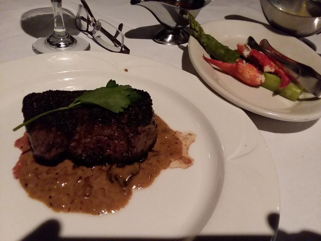 I ordered an espresso rubbed filet mignon with the Oscar option. The cost for this piece of meat with the extra crab and 2 spears of asparagus was close to $70. Obviously this didn't include my drinks or sides. I have to tell you that I have had a better filet mignon at Logan's steak house. I order it every time we go there and it's always melt in your mouth good. This one I had to saw with my knife and it definitely didn't have the taste or the melt in your mouth goodness.