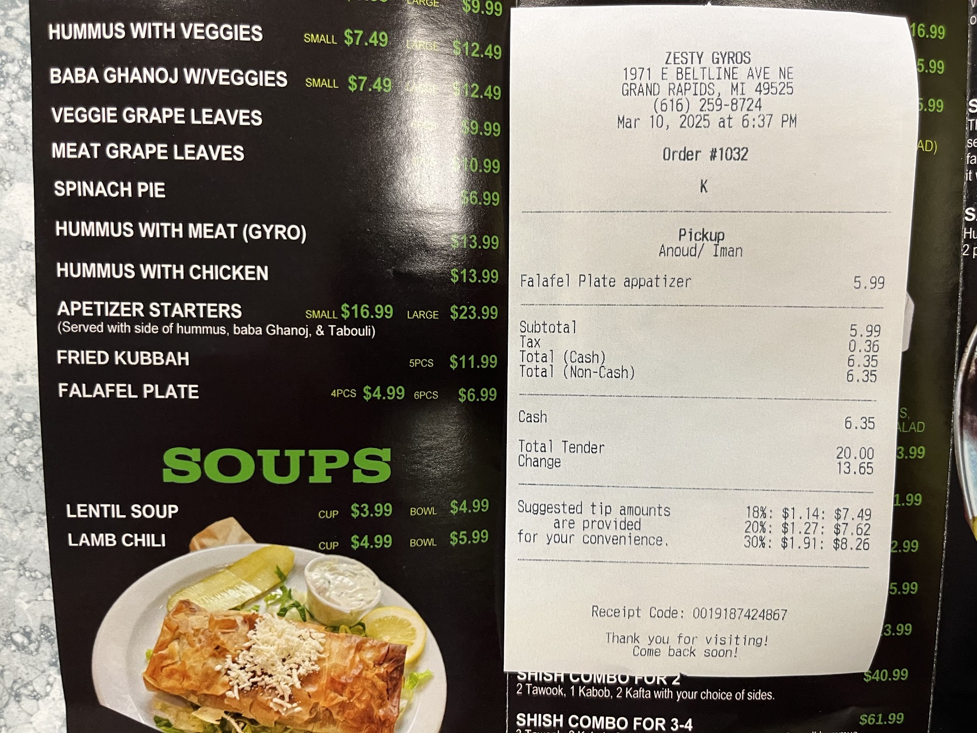 Read moreI went to zesty Gyro March 10. 2025 at 6:30 PM. I wanted to try their Falafel and they have a listed price on their electronic menu board of $4.99