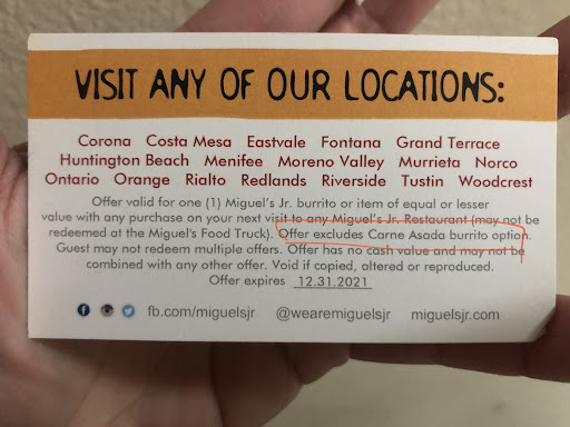 Read moreI grew up in Corona near the original establishment and I eat at Miguel's Jr religiously as I travel for work. Miguel's Jr on Barton road in Grand Terrace has had in one year more bad days or "mistakes" than all of those other locations combined over the last 30 years. It's not close either, they are the worst location, For at least a year they've been the worst location, and I feel sorry for anyone who eats here for their first Miguel's Jr trip. I thought the one on limonite was kind of bad But Grand Terrace is definitely the worst. Just got home with some brc's and I don't know what I just found in my burrito I lost it on my way out the door to take it back and ask if anyone can explain to me what that was in my burrito It definitely wasn't food. They will charge you and not give you your food They will charge you and give you the wrong items You could get overcharged The customer service is elementary This plastic thing I just found in my burrito is the last strike. My buddy I grew up with got a burrito from them this year he said he found something foreign in it and I thought he was trippin, guess he...
