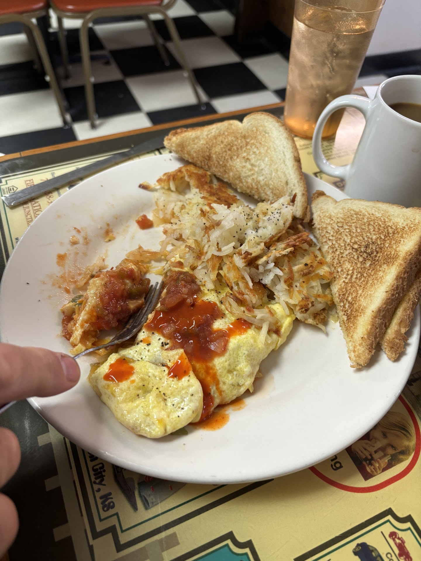 My friends and I ate there yesterday for breakfast. I've lived in Junction City for over 5 years and this was my first time going to eat there. The building looks small from the outside but it's really BIG on the inside as there's a large room in the back that is hard to see from the outside. I had the chicken fried steak and eggs. The meal also came with hashbrowns and toast and my eggs were scrambled. I ordered grits on the side with orange juice and water. All in all, I'd say the meal was pleasant. My eggs and toast were really good. The grits were ok, just basic grits. I didn't eat my steak there. I took it home because I was so full from everything else. My favorite was the hashbrowns. They were so good. I got up around 2 am hungry so I ate the chicken fried steak. It was still very good. A change that would be welcome is to let people pay at their table with their waitress. This will avoid all the people gathering around the cashier trying to pay. Some things I didn't like but certainly weren't deal breakers: it look a long time to get our food, we had a waitress who was very nice but for some reason she got replaced by this other waitress who just took over and seemed rushed, you had to tell the cashier how much of a tip you wanted to leave on your credit/debit card instead of being able to do it yourself, and they let a lady bring in a non service dog into the restaurant. Anyway, I will be going back to try more items...