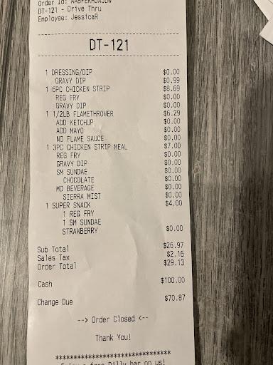 Ā Ā Ā Read moreIām on a massive road trip with my 6 pals. We decide we need to stop for food and this place was the only one in the entire town! We pull over and walk in me and one of the fellas go first and get our food fairly quick. The odd thing was we asked for ranch when we ordered and received gravy being told there was no ranch in the entire store. Then my next 2 friends go and also order and also asked for ranch this time however they were told they could get ranch. My next set of friends get their food with a burger covered in ranch so we know thereās ranch in the god damn store. However in actual places where we wanted ranch there was none⦠then finally the last 2 friends were up. They went and ordered and asked for buffalo sauce. Guess what they got⦠freakin gravy!!! They continued to go back asking for the buffalo sauce and asked 7 times until they finally got Buffalo sauce but continued to somehow get more gravy. By the end of this story there are only a couple take aways you need. RANCH ASKED FOR: 6 RANCH RECIVED:.5 (on one burger) BUFFALO SAUCE ASKED FOR: 2 RECIVED: 1(after 7 attempts) GRAVY ASKED FOR: (0) RECIEVED: 12⦠why did we get TWELVE...