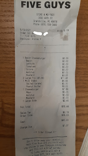 Read moreAt the five guys in grandville, I placed a pickup order on doordash at 9:15pm. I walked in right when it said it would be ready (~9:44). I bought a drink separate from my order when arriving. When showing my doordash order to the young blonde lady (Hailey, not sure if the spelling is correct) she looked back at me a replied with “Kkkk what about it.” I replied with “I was just wondering if I could pick up my order…?” She looked me up and down, and said “We need to finish your fries first before you can get that.” In a really rude tone. My boyfriend walked out of the bathroom mid interaction and later asked me why she was talking like that. Another customer came in pretty late to closing (9:51) and hadn’t even placed an order yet. Seemed like a bit of karma to me. I completely understand the etiquette of restaurants closing. I am a server for one of the best in downtown grand rapids. Now I wouldn’t expect five guys to have 5 star customer service but the blatant attitude and disrespect to not only me, but the guest coming in behind me was ridiculous. The guys in there were all very kind and normal. Hailey was the only one acting this way. Maybe she shouldn’t work the night shifts 🤷🏼♀️ I know from everyday experience you get screwed over in the restaurant industry, but it’s no excuse to make your guest feel out of place...
