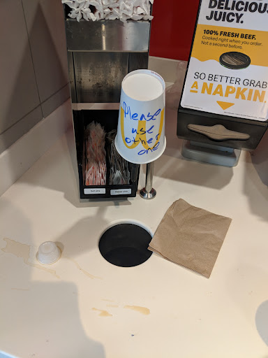 This location is probably one of the worst in Grand Rapids I've ever been to! (And that's saying a lot because 44th and Eastern McDonald's is absolutely atrocious.) While standing in line waiting for over 10 minutes for my mobile order to be completed, another customer walked up with her receipt and spoke to one of the employees stating that she has been waiting for over 15 minutes for her order that she had been pulled forward and drive through for. The manager gave her her bag of food and said "I was just coming out to bring it to you", but I had seen it sitting there for several minutes already. As the customer turned away from the counter, the employee behind the counter said "can't you see we busy? Damn a**!" under his breath--the customer did not hear him, but I sure did. My order was ready within just a few moments after that but no one put it in a bag tobring it to me and after a minute the person that was on back line came forward and put my stuff into a bag and handed it to me, thanking me for coming into McDonald's that day. He was the ONLY friendly person in that restaurant! It's really sad when no one else even acknowledges your existence (they all looked at me, but not one word was said) and someone from the back line has to come and help you with your order. And I can say that, because I used to run several fast food restaurants as an assistant manager! One other thing to note is just how lazy this team is. As you can see in this photo they've decided that putting a cup with this writing on it over the ketchup dispenser was a easier alternative to just replacing the cryo ketchup bag. And yes, it is actually just empty, it does actually work, I tried it it does work. They're just lazy. The restaurant was incredibly dirty, and they were not at all busy. This team really needs more training and better employees who actually care, even a little bit, about their job.