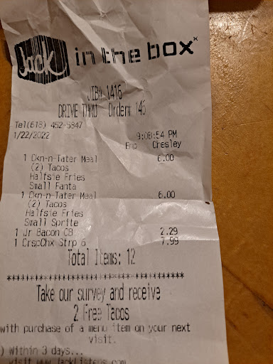 Read moreNow this Jack in the box is getting horrible. I ordered $22 dollars in breakfast food. My French toast sticks were so burnt that you could not eat them. My breakfast sandwiches that are over 5.00 a piece. Was soaked in grease, where when you opened up the sandwich cover It was full of grease leaking out so my bread was soggy and everything was soaked in nasty grease. My 3 hash Browns were stuck together in one little packet when there suppose to be in there own packet but it was in one filled with Greece at the bottom of it. Where you couldn't eat the hash Browns at all. So my $22 in food that I spent. I take it back up there granted. Yes, was an hour later because I tried calling them knowing that it was 4 AM. Cause I really didn't plan on coming back out again But since I couldn't get ahold of them. I went ahead and went back up there and was told that I can't get my food replace. I can't get my money back or anything. So basically when you spend money at Jack in the box now and if you get crappy food you're just stuck with it. You don't get your money back. I don't see how your business can run like that. So you're business lately does not seem like it should be up and running. You serve food that is nasty. You guys don't get the orders right ever. It can be the easiest burger and you can't get it right. I've never worked at Jack in the box. But I've worked fast food and I can tell you what goes on your burgers. I could probably make them with no problem and that's not being cocky.That's just being a person with common sense. Plus not to get my money back.Yeah, I have a problem with that.That's my hard-earned working money that I spent at your restaurant. I want my money back or I wanted my food where i could eat it. So would be nice for owner or someone in charge to get back with me since the manager couldnt do her job...