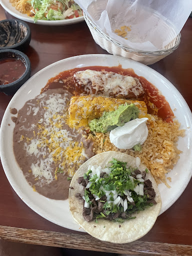 I had Enchiladas Jalisco, and my hubby had a vegetarian burrito (sorry I can't remember the name). We LOVED our meals!! Delish! My husband finished his burrito (it didn't come with any sides), but I had to take a large portion of my meal home (it was served on what looked to be a platter rather than a plate - huge portions!).