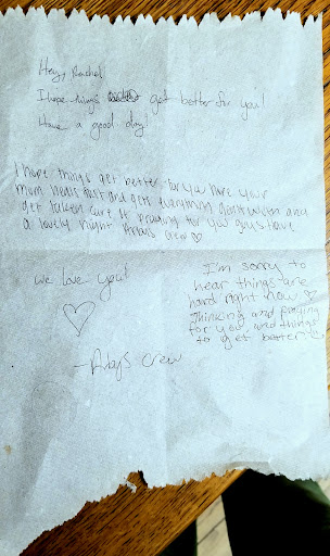 This note, left by complete strangers — the sweet crew at Arby’s — had no way of knowing we were a mother and daughter clinging to each other through a storm. We could've well been tied by any relationship to one another; friend, aunt or niece etc. No way of knowing we had just come from the emergency room (other than a simple wrist band) while standing awaiting our meal. No way of knowing how deeply we needed a sign that we’re not alone. I opened the letter that was on top of our much needed food, no way of going home and cooking with tears pouring.