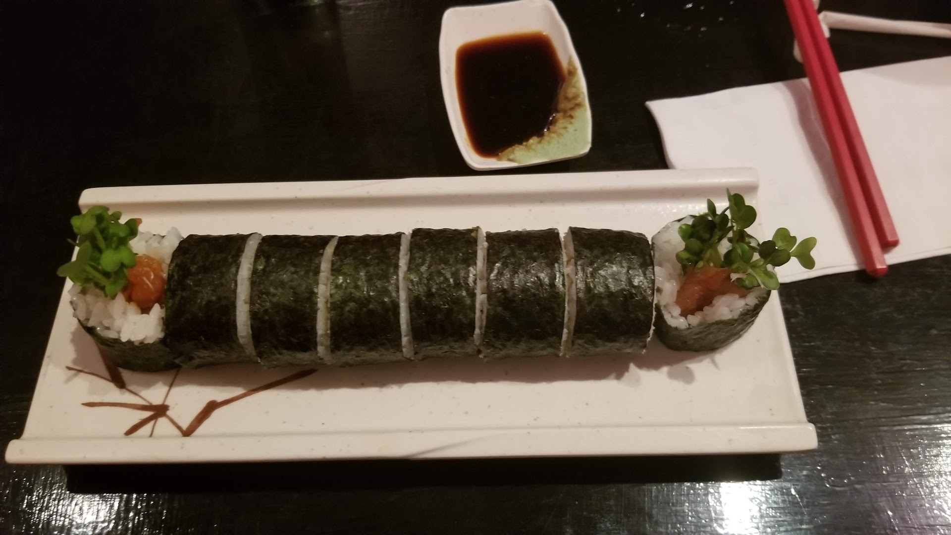 Absolutely stellar grub! I usually have a rule with sushi. I simply dont eat sushi more than 10 miles from an open ocean...usually a good rule of thumb. Decided to take a risk and trynit anyway... and I must warn you...these people must have sold their soul to the devil 'imself as payment for their sushi making skills... truely artists. The place is a little under decorated, seats were slightly uncomfortable. Ordered a random off the menu roll. It was a... ahi tuna roll. Got miso soup not the best I've ever had because i prefer it a little salty and most others dont. pretty good regardless. Noticed that the wasabi was a uniqie color and clearly not made from your typical devil cocaine. Low salt and regular soy sauces were available. Got my meal in a timely manner even with a fairly busy night ahi sushi roll... end pieces were turned on its side with some juvinile raddish sprouts poked in it. Cute. First thing I noticed is that it was very simple. There was no cream cheese, cucumber bla bla bla or avacado or other stuff piled in there just tuna...i was fully prepared to be unimpressed but hungry anyway to my surprise this little simple looking sushi roll had aproximately 3,567,294 different unique flavors. It was like...a black friday sale at best buy. And the flavors were the people rushing towards the electronics section that, in this analogy, are represented by my taste buds... Long story short...there was some sort of sause on the fish and it was insanely good. Give them a try you wont regret it unless your top 10 resturants include more than two major fast...