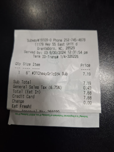 Read moreWe stopped in for lunch today. The food was fine, service was fine. The 3 star rating is for the fact that they didn't wrap our sandwiches up like has always been done. We were eating in, but at Subway, when you unwrap your sandwich, THAT'S YOUR PLATE, right?? I'm not sure if that's a new, cost saving measure or what, but I didn't like it. I then had to eat my wrap using a napkin as a plate. Then when I didn't eat the whole thing, I had to ask for a paper to wrap it up... I will be completing their survey and...