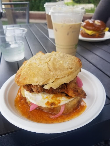 Read moreReally enjoyed our experience here. The staff was cordial and accommodating, the coffee was great and the sandwiches were on point. I got a large house and my wife got a large iced vanilla lattĂ©. As far as food my wife got an amazing fried chicken egg and cheese on a biscuit (I know it was amazing as i stole a healthy bite when she wasn't looking đ) between the pickled red onions and hot honey, I was a little envious. I got a sausage egg and cheese on a bagel which was great but honestly I will be getting the chicken next time for sure. We sat outside under an umbrella but there was plenty of seating inside as well. Plenty of parking. The atmosphere was was kind of country as its next door to the iconic Granville Mill but equal parts modern contemporary. They did a great job transforming the old train station into a trendy coffee house. Pictured you can see my wife's sandwich and kind of blurry in the background is my sandwich. After a generous tip our total was...