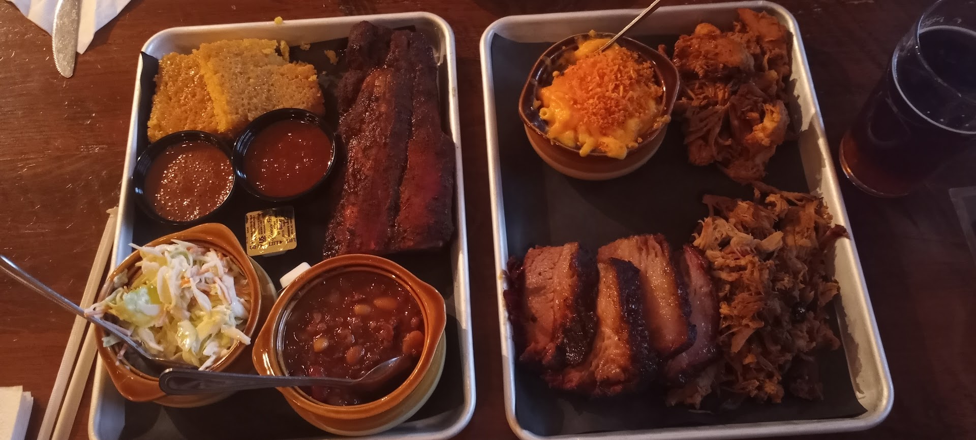 Ribs and pulled pork were 10/10. Brisket was juicy n nice 9/10 (had an awfully large fatcap) Pulled chicken was all white meat 8/10 (wudda been better, to me, if it was juicy, dark meat but u gotta appease the majority) Beans contained ground beef or sausage and were sweet n delicious 10/10 Mac n Cheese, the best Iv ever had at a restaurant. 11/10 Slaw was 8/10. Mayo-based dressing needed a lil flavor boost but was good. Cornbread had something very sweet brushed on top. I was expecting savory but still good. Great for dessert. 8/10