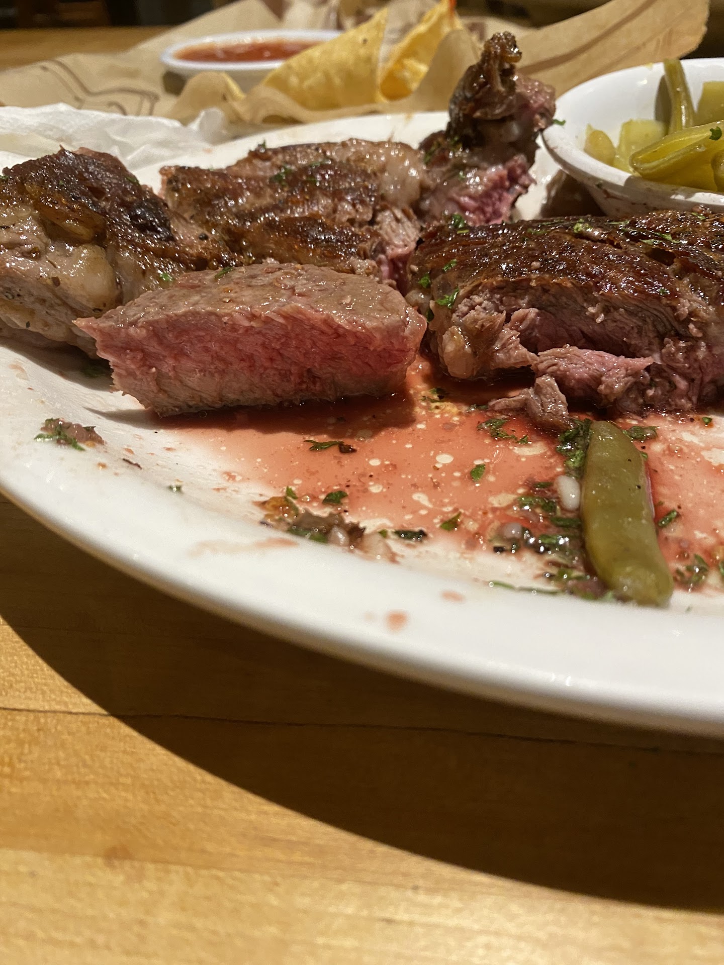 The restaurant was not very full and waits on drinks and food were very long so I suspect there may have been some staffing issues. We order two cocktails which took about 20minutes to come out, along with our appetizer a few minutes after. Besides the confusingly long wait, the cocktails tasted good and the appetizer was good. I ordered a 14oz Medium Rare Ribeye and this is where the issues began. The steak was seemingly over cooked on one side with not much attention to the back side. The overcooked side of the steak was a hard, crunch texture while the inside was cooked completely until halfway where it was all pink through. I've noticed other pictures similar to mine concerning the steak. It didn't taste good so I did not eat it. Our waiter took the steak off the bill and at the time that seemed appropriate but looking back in very dissatisfied with how this situation was handled. I feel as if a manger should have came out or maybe even something subtle like offering a new one since the previous one was removed. We then ordered a dessert through the touch monitor (I try to avoid ordering through these usually) and there must have been some confusion because that took a very long time to come out and we had to "Call our Waiter" on the touchscreen to inform him we had an order placed for quite some time.
