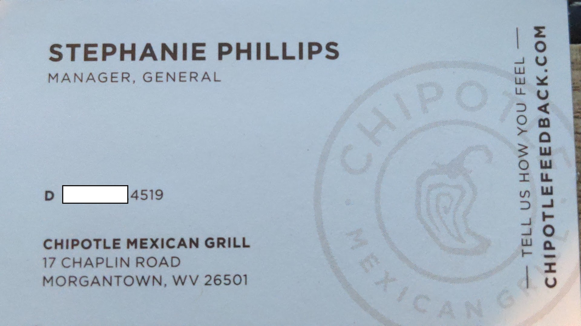 Probably the worst Chipotle experience I've had. It is a 30 minute drive from home, so, it is supposed to be a special treat for my daughter who really likes Chipotle. My wife ordered online while I was on my way with no hint that there would be any problem. When I arrived, they had no record of the order, eventually explaining that their system had been down "all day". If the system is down for that long, just don't accept an online order, other companies can manage that. I had to get my wife to take a screenshot of the order and e-mail it to me. It was a family order, so it was kind of long and the text resolution didn't quite zoom in enough. Then go through the regular line. Again, had we known that online ordering wouldn't work, and if we still really wanted Chipotle, we could have just done it the old-fashioned way and write down everyone's order before leaving to go order it. Finally, thinking that this was a manager calling moment, I grabbed the card by the register "Stephanie Phillips - Manager, General" and called the number ending 4519 and a man answered with a hello, when I asked for Stephanie Philipps, he said I must have the wrong number. With all of that, OK, I get it, systems go down, but the staff treated me like it was my problem. As if it was my fault for ordering online, and not only that, but something also I had to fix for them.
