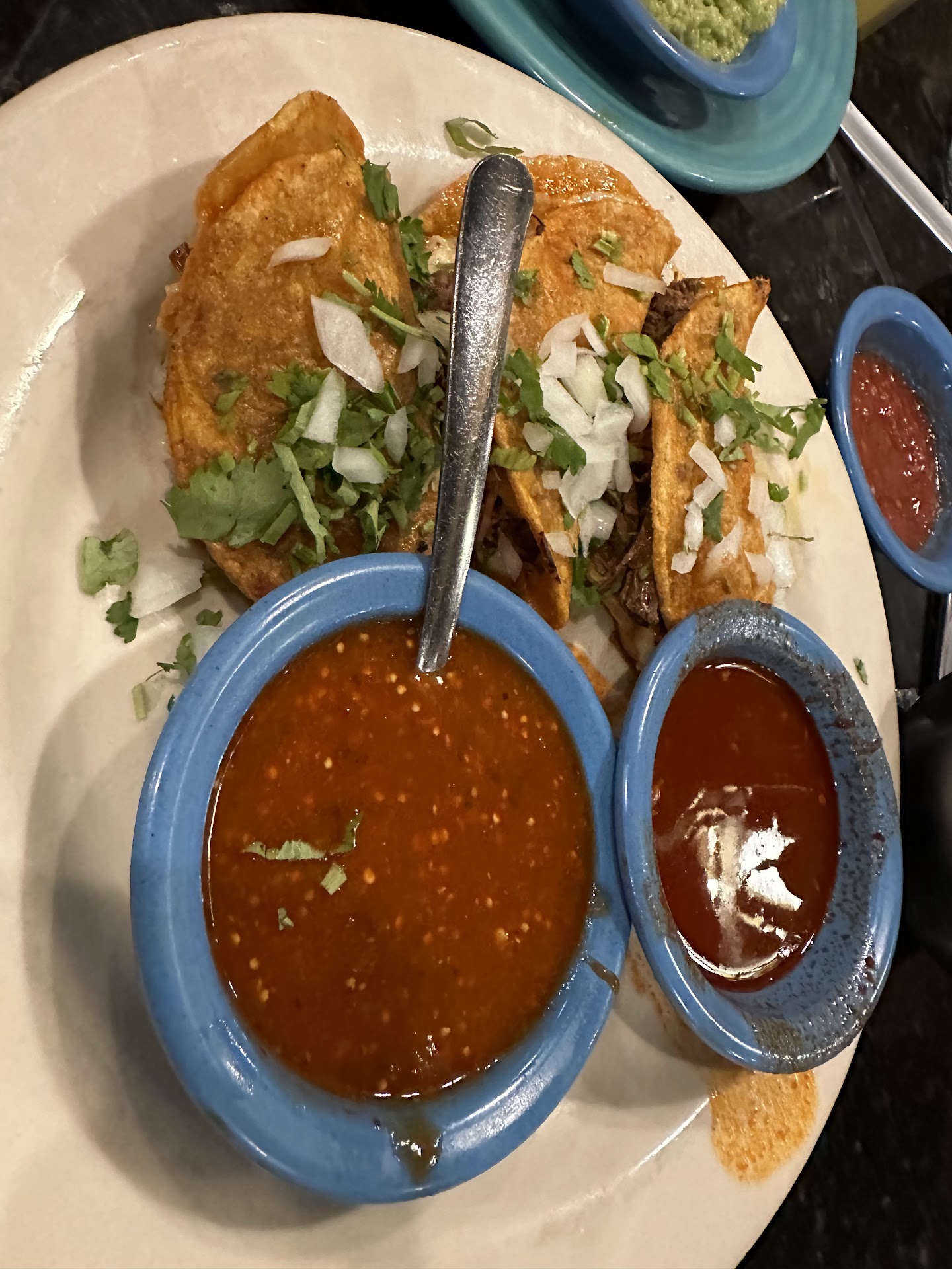 Food- 3 stars- everything leading up to this was great until the food came:(. Started with the chips and salsa which were very good. I liked the salsa because it has a bit of a kick to it however once we got our entrees it all went downhill. I love Mexican food probably one of my favorite types of food and mostly enjoy most Mexican restaurants. I got the combo #4 which was two beef tacos, a beef enchilada and Chile Con Queso. The tacos were so bland and watery. The beef had very little seasoning. The consistency of the beef was watery which made it messy to eat. The Enchilada was wasn’t much better but at least the Enchilada sauce gave it a little more flavor. The Chile Con Queso was the best thing on the plate and that’s because of the cheese. Beautiful restaurant but food is not the top priority here. I cannot recommend this...