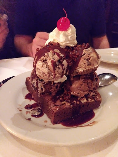 For dessert we ordered the brownie sundae. It was a warm peanut butter and chocolate brownie with scoops of chocolate and peanut butter cup ice cream, and topped with pecan chocolate butter nut sauce, whipped cream, and a cherry. It is not exaggerating to say this is a dessert sufficient to four adults. Better people than us might have tackled it with two, but we didn't want to regret the evening. I'll also note that with a price of $9 (a steal for its size and its delicious, rich taste), they comped it as another gesture for the earlier salad snafu.