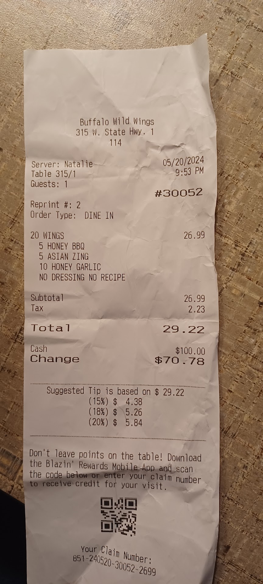 Read moreThis was literally the worst restaurant experience I’ve had in my foreseeable memory. We eat out a lot too. It was not terribly crowded there, and there were at LEAST 6-7 people working the floor, probably more. We waited 10 minutes once seated just to have someone come to our 2 person table. We ordered drinks and food immediately. Then we waited 45 minutes for the food without our server stopping at our table once to check in. Also never told us there would be such a long wait. We were about to get up and leave and then the food arrived. My husband’s boneless wings were lukewarm and drenched in sauce, not at all pleasant to eat. My bone-in wings were warmer and not terrible, but not spectacular considering how long we waited. After we were visibly finished with our food it took about 20 minutes to get someone’s attention for the check. During this time about 4 employees were just socializing and goofing around in our line of sight at the front of the restaurant, and one of them I believe was a manager. This restaurant is clearly very poorly managed and unfortunately Buffalo Wild Wings has lost our business.