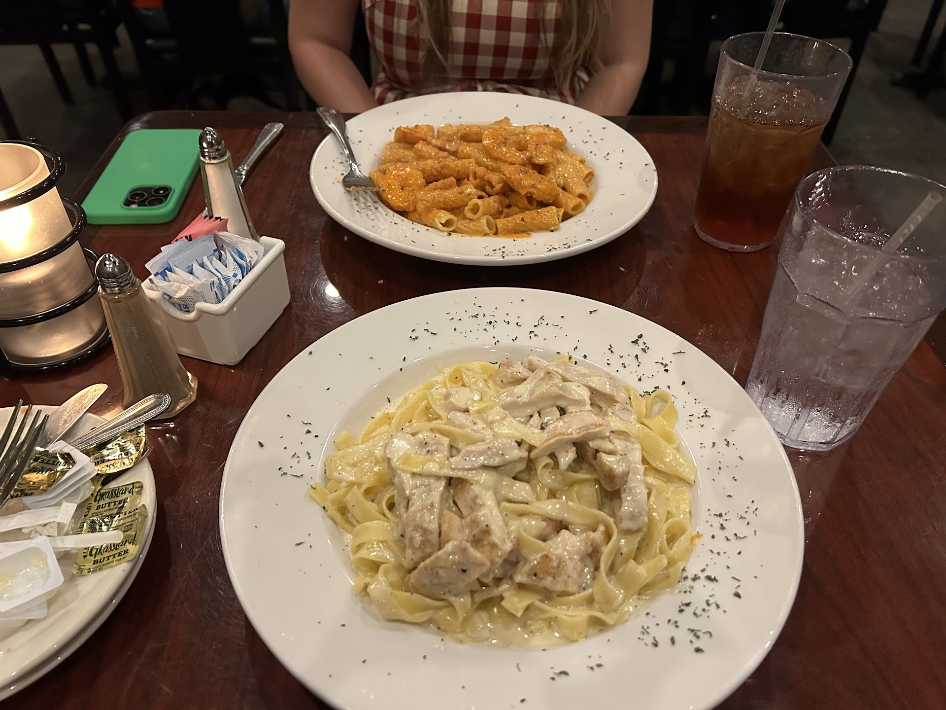 Went to the restaurant for our reserved time. It was just 2 of us at tis moment. We were waiting on the other 3. I don't think anything was written down or documented we had a reservation. We walked in and said I had a reservation for 5 at 6pm. They tried to sit us with another group at first. Odd. Then we got seated at another table with 6 place settings. Host took one away. Ok. There were 2 menus on the table. Never received anymore menus than that. 15 minutes of waiting for our party, they call and say they are here, but can't find us. Remember that weird thing mentioned in the reservation call? "Ira Woods". That is because there is another location .6mi away! Anyway, the rest of our party shows up. It's BYOB. One member had a 6pk beer, but they had no ice buckets to keep beer cold. Still only had the 2 menus. Placed an order for apps. They brought bread too. Then they gave us plate of Bruschetta on the house. That was nice. There was about an hour in between placing the app order and taking our dinner order. It was fine because they got very busy for a Tuesday night I thought. BUT, during that hour, a waiter dropped more bread off for us, but then quickly realized it was meant for another table. This happened again when a plate of calamari was dropped off but then taken away. Then when we were nearing the end of our dinner, I had asked for a couple of to-go boxes, but the waiter just took my plate and the others to the back and boxed up. I felt I was in one of those funny TikTok pranks where they take Dad's plate while he is still eating.