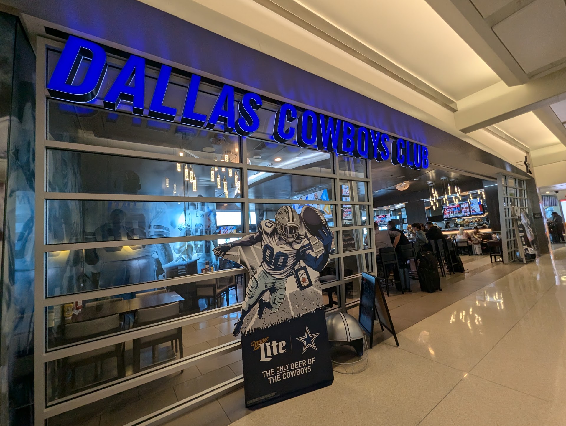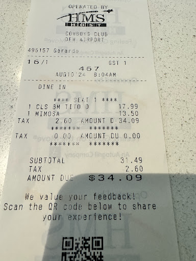 Read moreI travel often through DFW and frequently find myself delayed. The Cowboys Club is by far the best place to just sit and have a pretty quiet wait. They don’t seem to run anyone out for lack of ordering. The food is pretty good, more lacking in presentation than flavor. Pricing is silly but it’s captive so what ya gonna do? The one thing I’d warn about is watching your servers and only ordering from the ones who wash their hands. It’s a common sight to see people clearing, sweeping, touching communal cleaning products and cash, not washing their hands….and then preparing your order. No way to know if hygiene is better in the kitchen because you can’t see back there. May not bother everyone, but it puts me off ordering until I actually see one doing dishes or the like and washing up after. Not that the majority of workers ever check in - the two bartenders on shift currently are sitting at a table by themselves, chatting. One waitress seems to be doing everything else on the floor. Couldn't this be solved with better training? I guess the revolving door of customers doesn’t demand high...