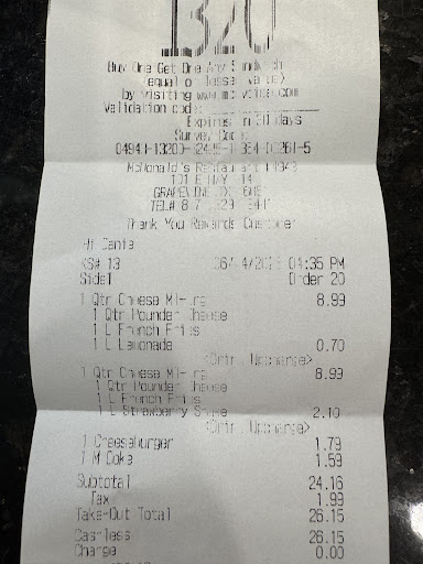 I would not recommend eating here at all. Find the next nearest McDonald’s. I came here because it was a play place and we’re staying in a hotel so my kids needed a place to let out some energy. Never again. As soon as I got out of my car there were at least 4 or 5 cars waiting on their food, the lady who worked at McDonald’s brought out a bag of food and started to argue with a man in a van about the order. She walked inside, I assume to fix the order and he drove off. I walked inside it was no different. I ordered 2 orders of hot cakes, 2 chocolates milks and a small iced peppermint mocha for dine in. I got my chocolate milks first thing and went and got a table. They called my order and it was bagged like it was to go. One of the ladies got a tray and sat it on a tray because she remembered it was dine in. I stood there for a few minutes and waited on my iced drink. After standing there they asked what I needed, I told them. No one ever made it. By this time there was 7 or 8 people waiting for food and correcting wrong orders. So I went and sat down because I wasn’t dealing with it. Right before leaving I went up to the counter again and told them I never got my drink, the lady who took my order asked the people making orders to make my drink. No one ever did. I was going to talk to the girl making food but they were arguing with people again about food. So I left. Hardly any tables cleaned. Drink station was a mess. Food in the floor everywhere. Would not recommend to anyone... they need to put people in charge there who are concerned with how to properly run and maintain the...