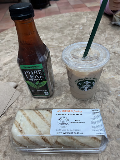 Read moreLots of choices, has a microwave, Starbucks inside with fairly quick service. Quick grab and go. No seating inside the market but there are plenty of tables around to sit at if you want...