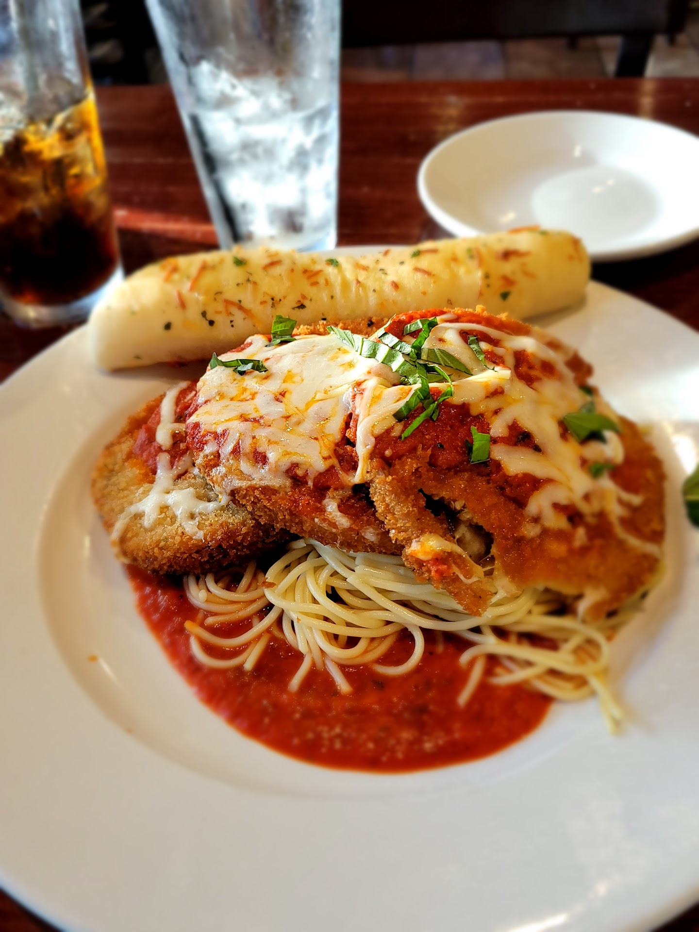 We also enjoyed homemade breadsticks as these came first as we were waiting for our desert and salad course to arrive. These were flakey and enjoyable, easy to break apart to enjoy the two dip options (ceaser and spicy house marinara) . The dips themselves were okay-to-good by themselves, almost seeming heavy own their own without either totally landing as a true compliment to the breadsticks. We probably enjoyed them most when my daughter created a combo of the two dips together on a...