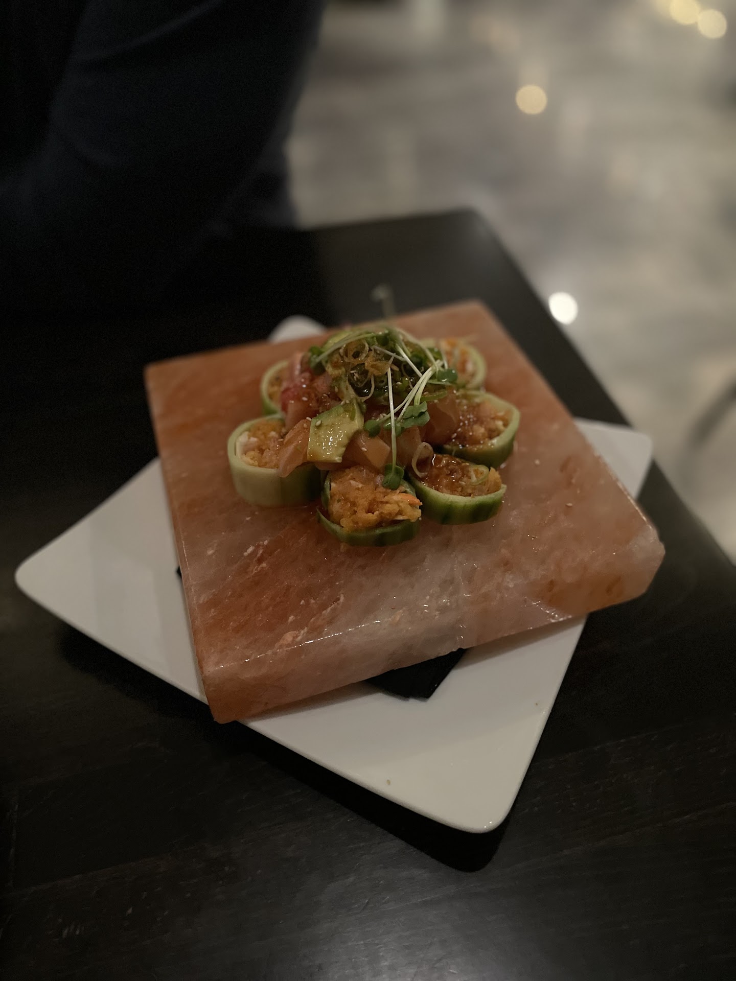 Ordered 7 pieces of sushi/sashimi - 5 tuna and 2 salmon. These were delivered last of the items we ordered. The tuna was not good, rubbery. Of the 7 pieces we ordered, 4 went back with the pre-busser to the trash can because we did not want to eat them. Prebusser even looked a little surprised when we told her she could take the plate and didn’t ask for a doggy bag.