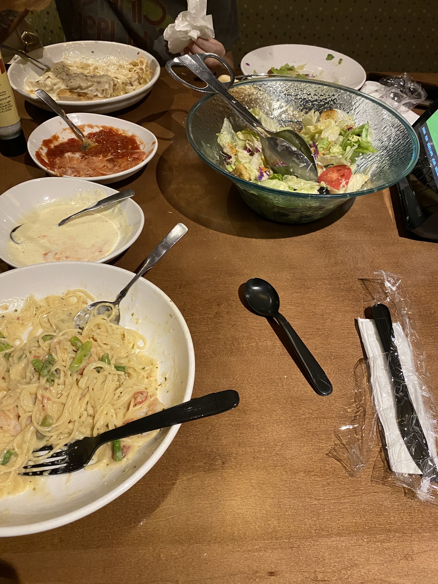 Read moreWe stopped to eat here yesterday around 2. Super excited because our kids love pasta and it was our last stop before checking in to wolf lodge after a 4hr drive. Right away we seemed like an inconvenience⊠there was 8 of us including 6 kids ages 11,6,6,20m,9m and 9m. The lady at the front didnât know where to sit us and we waited which was fine it was the smirk that she made when we asked for 3high chairs. Then the waitress came and said to my husband that she had us so we started to follow her and the table wasnât ready when she was asked by a coworker what was going on she said in a condescending tone that she told us she had us but that we just started following her and the table wasnât ready we must have just not understood her so she started talking to us in Spanish like if we didnât speak English. But she didnât tell us to wait or give her more time she looked right at us and said she had us. Once we were finally seated she asked my husband if all the kids were his not once looked at me when she asked which I thought was very rude. He answered yes they are and she laughed and said it was a really big family. That made us a bit uncomfortable bc it made it seem like it was a bad thing to have so many kids. Then my toddler accidentally dropped his soda. I cleaned up the ice went and got napkins and dried it to the best of my ability. My husband informed her just so she knew what had happened. She said âthere is nothing I can do about it nowâ and walked off she did not bring us an extra cup nor refills. The whole time she only refilled my sons cup and that was it. We ended up leaving not finishing our food nor taking to go plates bc it was just a humiliating experience. Having kids in any amount shouldnât be an issue. And asking my husband If all the kids are his was rude. We plan on going back to wolf lodge in the future and will stick to the restaurant...