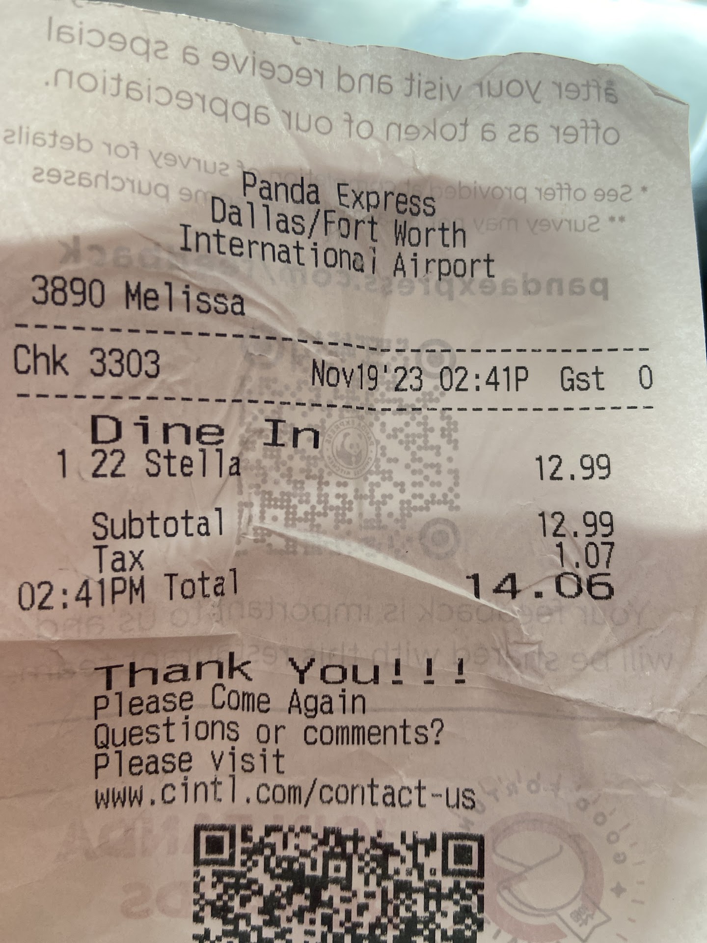 Read moreFirst off this was not related to Panda Express but at the bar area in the Dallas Airport, I think E 32 area . I could have not had a more horrible experience at this place . First off I purchase some food from Panda Express . I then walk over to the bar to charge my phone while I eat my food I just bought . The bartender comes up and says you can’t sit here unless you are buying something from the bar . Ok so I ask for a beer that I am going to give to the patron next to me. She said you can’t do that and are you going to tip me if you sit here because I work for free and only make tips , I say sure I will tip you bring me a beer. Mabye two minutes pass and she comes to close my ticket . I was like wow!!!! So she hands me a ticket for $14.06 . I hand her $15.00 cash and she said that is not good enough . She throws my money back and grabs my beer and tells me to leave. No mam, at that point I told her to call someone and she said she was going to get security , I told her to please do so . After she leaves her bar unattended for Probly 5 minutes she comes back and just stares , I continue to eat my food . A few minutes later a TSA agent or security person comes up and tells me if I don’t leave they were calling the police . I told them to please do so . I would have loved to hear the police response to a customer didn’t leave me enough tip so I asked him to leave and he didn’t . I was shaking mad and unfortunately I had to catch a flight or I would have sat there and waited for the police to arrive . I threw my food away that I spent $20.00 on because I was so appalled and in disbelief that this was happening . I trust that this level of service is not what your organization normally puts up with . As a business owner I would want to know if my employees treated patrons like this . I will be awaiting a response from someone , as this was totally humiliating and embarrassing and was totally avoidable with a properly...