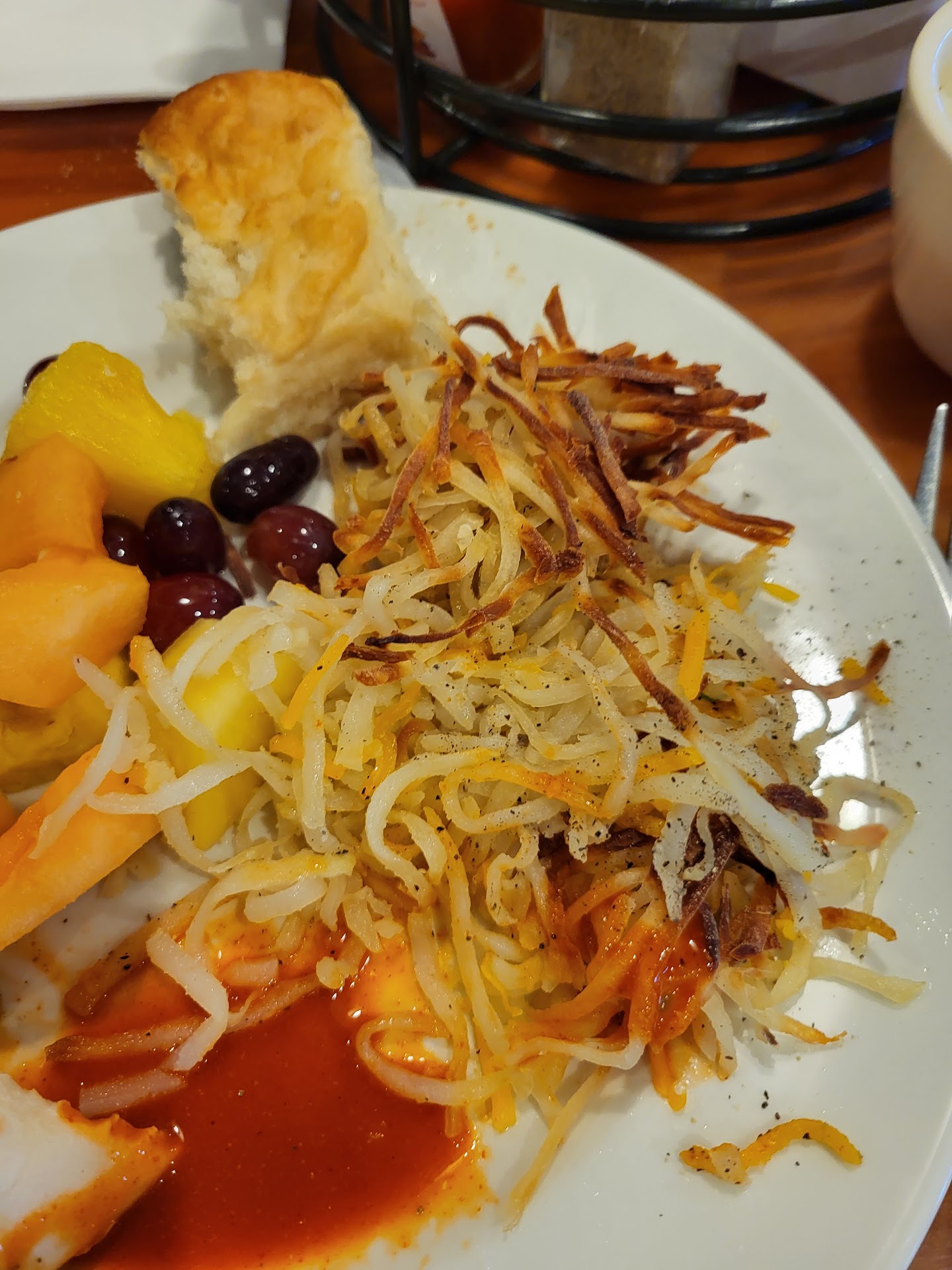 The only thing good about the buffet is the fresh made omelettes and fruit. They have a big selection but most things are cold. Went to get plates and we noticed there was food still on the plates and silverware. Looked through the plates and most of the were like that. Young (white kid with a big afro and no hair net) guy brought out fresh plates, then the very first two had watery-food sludge on them. I then told the young guy that those plates had food in them also. He quickly and rudely responded "Hey, we ran them through the wash and I brought them out here!", as if he was mad at me for what was happening! I then replied, but these have food on them also, I tried to show him and he ignored us until he was finished and then quickly walked away. After the plate/silverware ordeal, we sat down at our table and the air vent above was dripping water on us and the food!! We prepaid for the breakfast online. My guess is that management and owners aren't paying attention to the quality of services that are being delivered to guests. They screwed up our room also, we got stuck in a handicap room. How pathetic! I hope that room wasn't needed by someone who really needed it! Wasn't offered anything other than a roll-a-way bed. Was told there weren't any other...