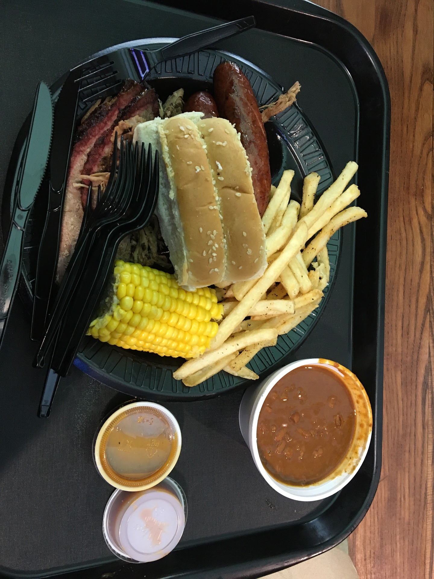Read moreAs far as airport food goes, this wasn’t as bad as I would have expected. Ordered a BBQ combination plate which had a choice of 3 sides and 3 meats (with rolls similar to hamburger buns available upon request). We got the brisket, the pulled pork, and the sausage with the corn on the cob, baked beans, and French fries. Unfortunately the ribs aren’t an option for a meat choice. The fries were a bit soggy, but the beans had a nice subtle heat, as did the sausage. The pulled pork was a tad salty but was more tender than I thought it would be, and the brisket was filling. It came with two BBQ sauces. We tried splitting it among four people, but it would be better suited to be split among 2-3 people. I actually went back and got an order of pulled pork nachos because I was still hungry. The picture doesn’t look appealing at all, but the queso, beans, and pulled pork combination definitely hit the spot. They served the food very quickly (they’ll call it out and you pick it up) and there’s plenty of seating. There’s drink dispenser behind the counter and when we were there, there wasn’t really a line to speak of. Overall it was cool to try this spot since I’ve heard good things about the actual restaurant. I wouldn’t recommend BBQ for lunch if you’re just sitting on a plane for hours on end, so if you do go for it, split it...
