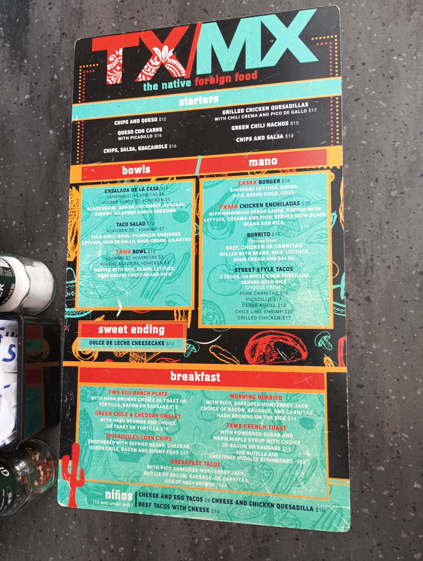 Read moreAs we were stuck on a layover to our Calif Destination due to our original flight being delayed, we thought a little chips n salsa with a quick cocktail would distract us from our flight frustration. Needless to say although the 2 servers tagteaming our 2 top were on point the chips & salsa were just "ok" , the Margarita not thirst quenching and $40 for my husband's 1 Bourbon drink was beyond OUTRAGEOUS. When the bill was brought to the table and I saw the $76.86 total I waived the server down to inquire. He went and asked the Manager about the bourbon overcharge and was told " that's what Corporate charges". Let's call it what it is, "CORPORATE GREED" . IN NASHVILLE TN BOURBONS ON BROADWAY AREN'T $40 A DRINK. A small bottle of Buffalo Trace is under $40 in Nashville that yields 8-10 pours. TXMX at the DFW airport is NOT about serving customers a great experience rather putting out mediocre and OVERPRICED food & beverage. Never again while laying over through DFW would I give TXMX my business. ...