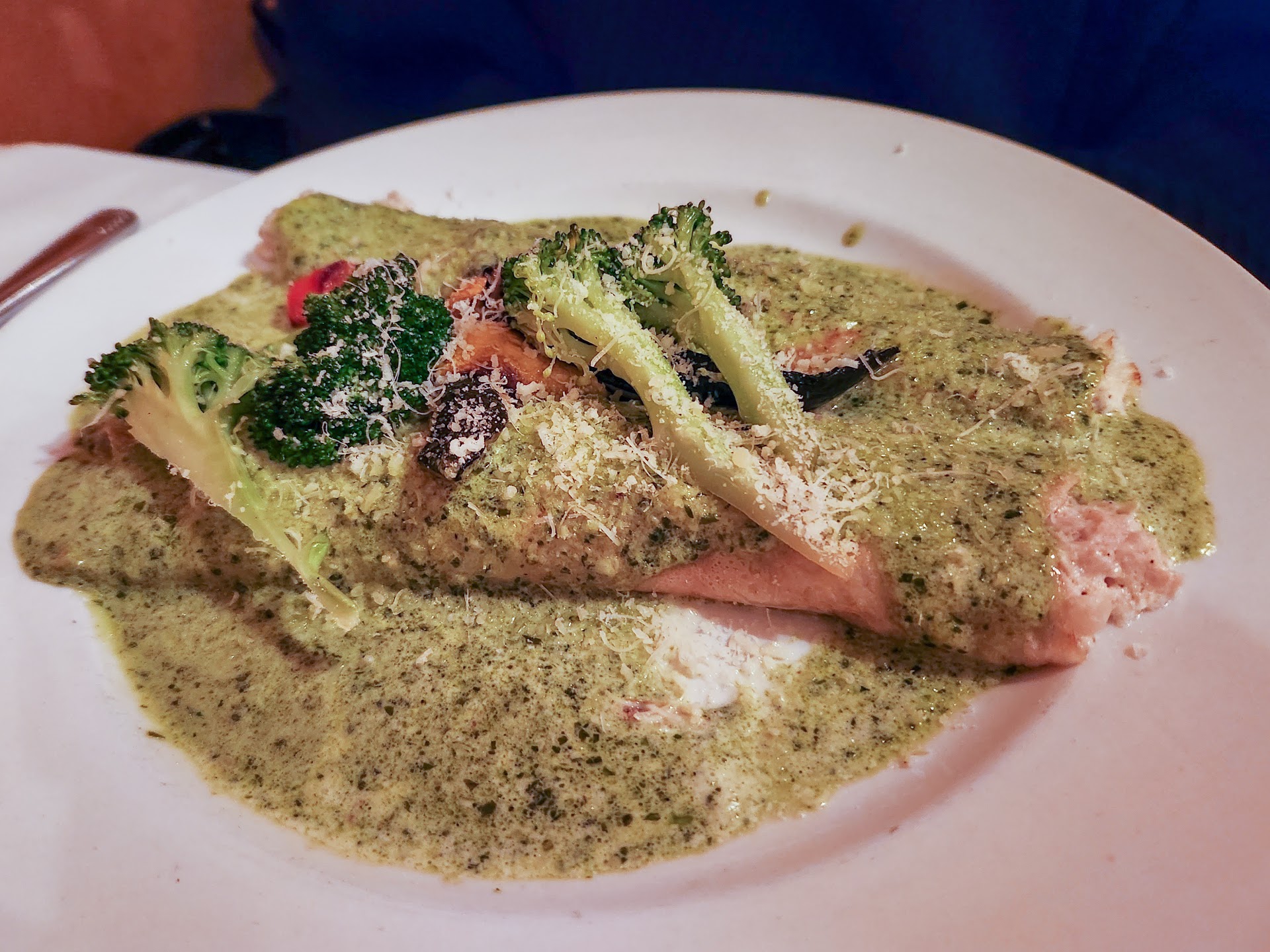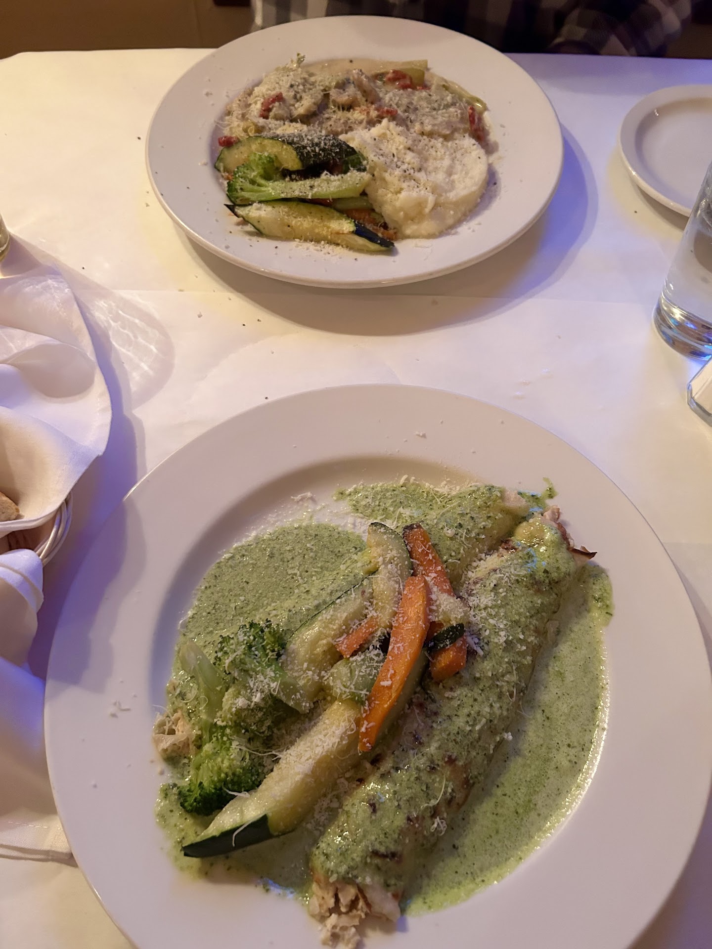 For my main entree, I ordered the cannelloni salmon, but unfortunately, the salmon itself was overcooked and tasted like it had been premade and then microwaved rather than made fresh. The salmon is very low quality, I would guess a frozen Atlantic salmon which is incredibly disappointing. The sauce accompanying the dish was quite bland and lacked any depth of flavor, and the large, uneven chunks of grilled, oily, unseasoned vegetables felt clumsy and overwhelmed the plate rather than complementing the main item.