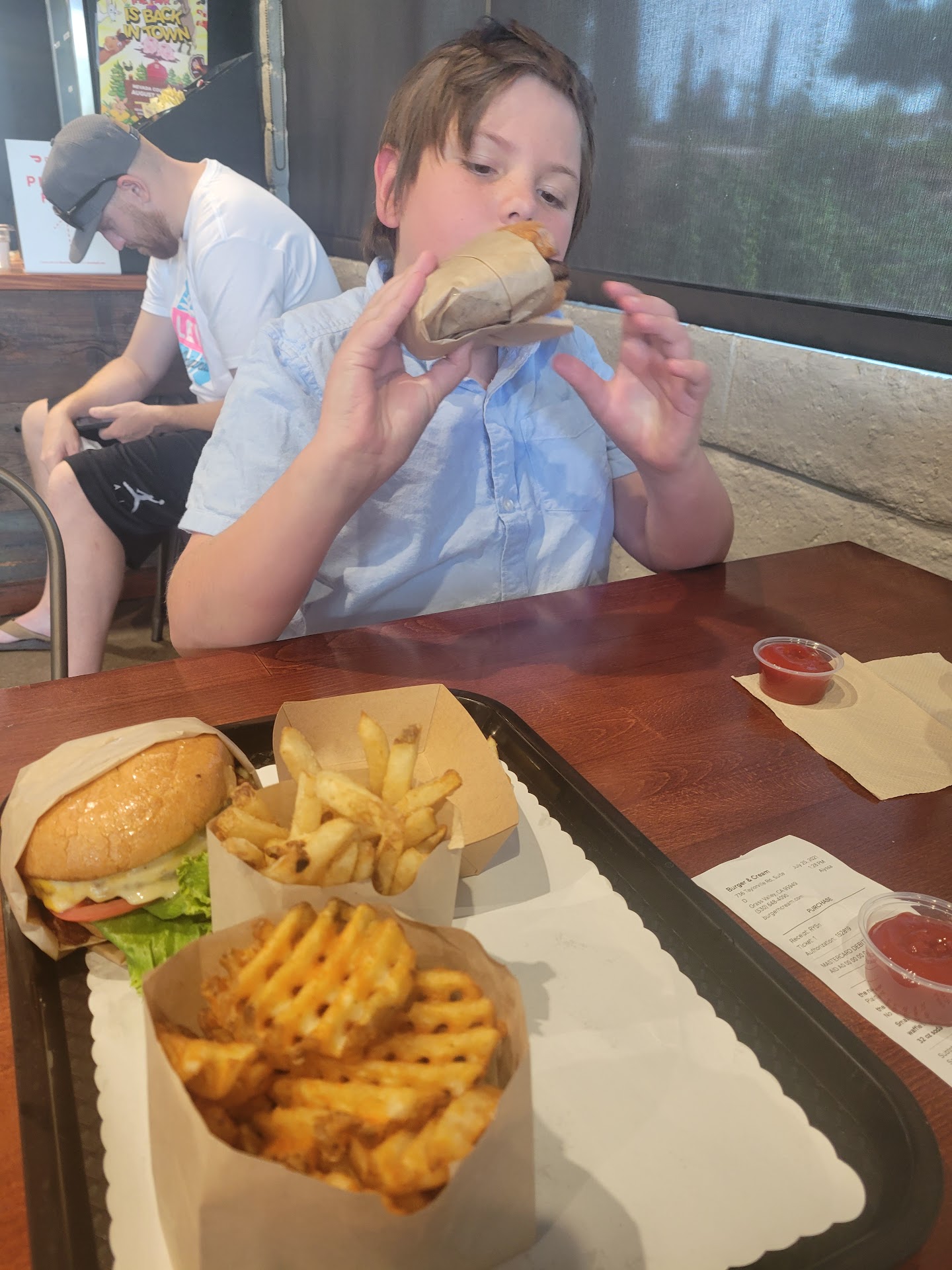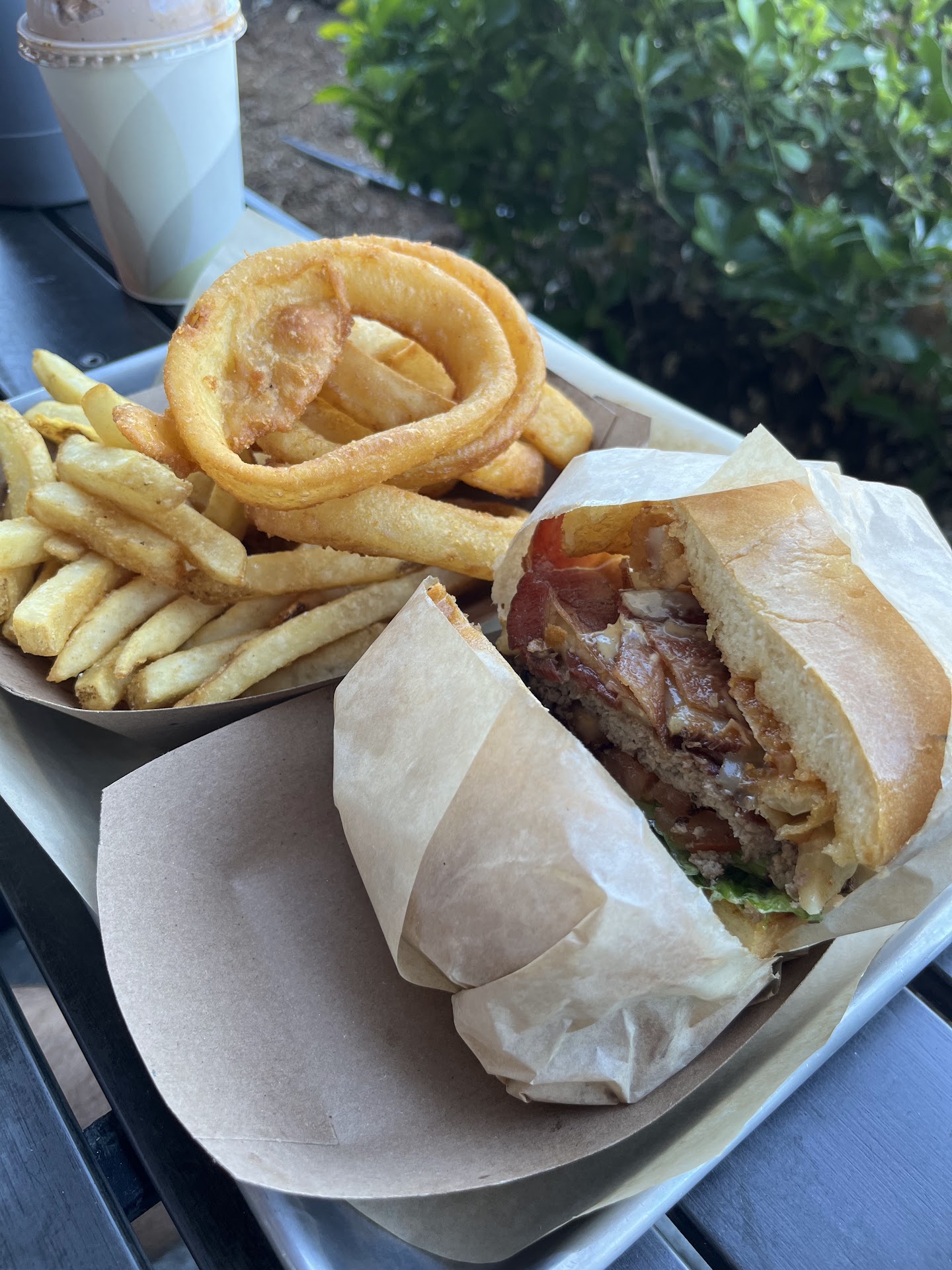 There were 3 of us plus another at home waiting for some fries. We ordered our burgers along with a family size waffle fries, a family size onion rings, 2 waters, a regular size iced tea and a small size milkshake. My husband paid for the meal including a tip. As we waited for our food to be prepared, we realized the cashier hadn't given us any condiment sauces for the waffle fries and onion rings. So my husband approached the counter and asked for some sauces. After paying $10 for a family size onion rings and $7 for a family size waffle fries, he was told that he could get one sauce per family size tub of fries and onion rings. This is a STINGY, STINGY, STINGY amount. One tiny, not full to the top container for a family size portion of fries and family size portion of onion rings is not enough, and we prefer not to share germs, thank you! We wanted one small container of bbq sauce each and one small container of ranch dressing each. That is 2 sauces per person for a total of 6. Anywhere else, that is a standard ask and it is fair for the price we are paying. In the end, he paid another $1.30 for 6 total sauces. He got 1 sauce for 2 family size tubs (not per family size tub) and paid extra for 5 more.