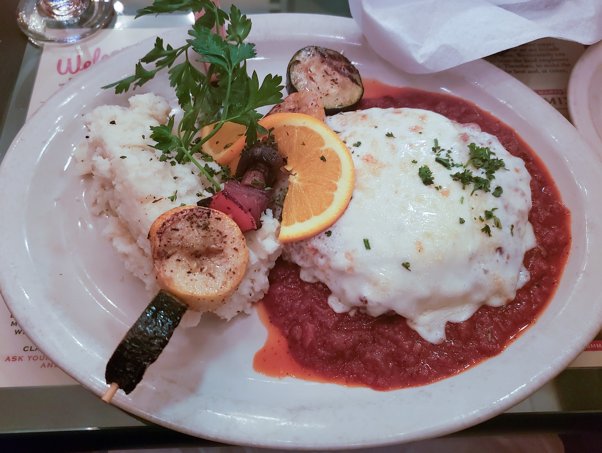 Came here with a friend for dinner, based on word of mouth. Remember that term? I digress. There was a 20 minute wait, but hard to complain for a Saturday night. We were quickly attended to after being seated by our very friendly server, Bob W. Water and delicious warm bread came soon after. Lots of good choices on the menu, but I decided on the Chicken Parmesan and my friend got the Tri Tip Sandwich. My friend was very happy with her sandwich and had no complaints about it. My chicken parm was heavenly! I can't think of where I've had better, at least here in the states. It had a mountain of mozzarella cheese and a very savory sauce. Just writing about makes me want to go back very soon. It was served with garlic mashed potatoes and skewed grilled veggies. Both were really good!
