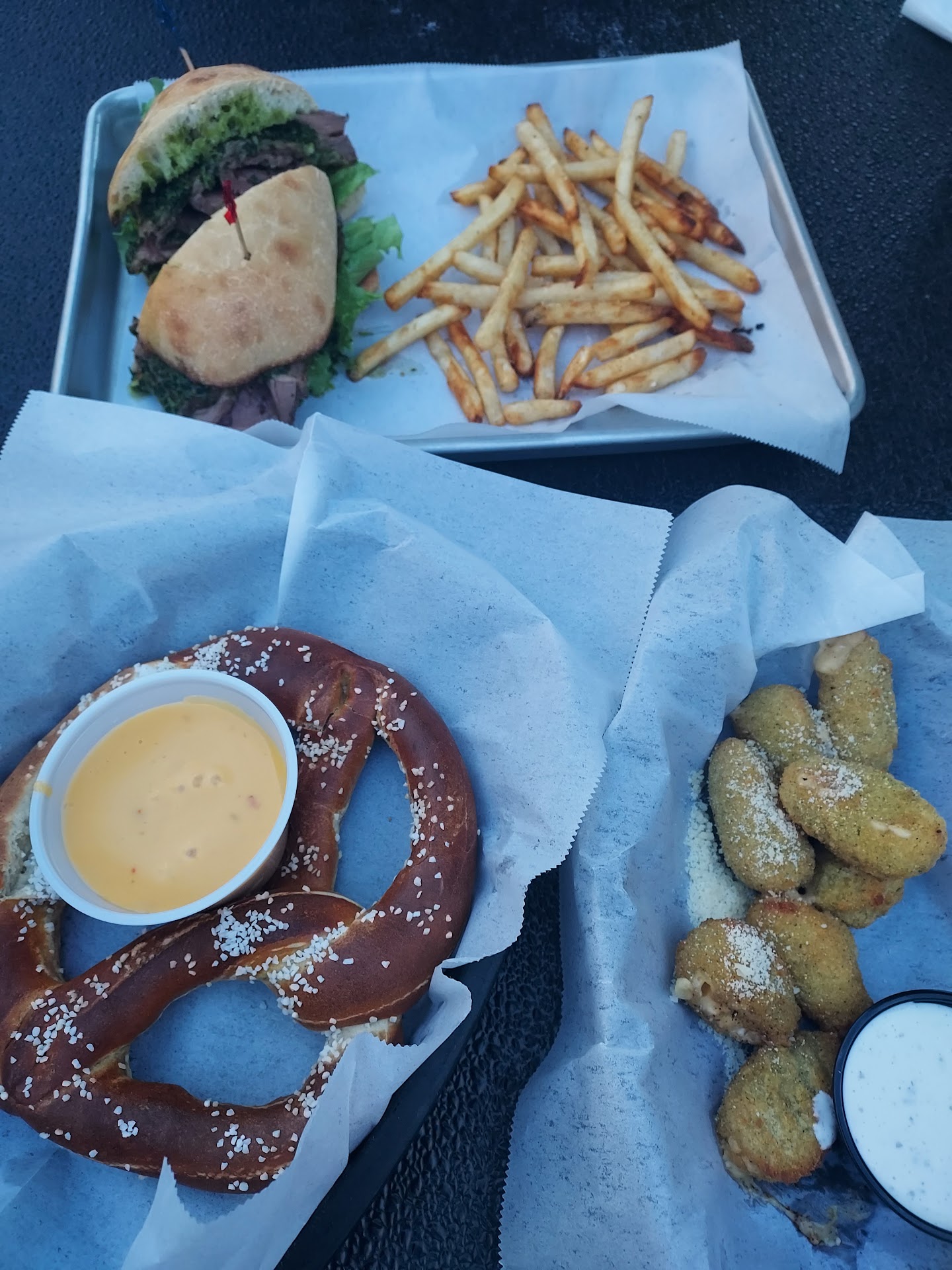 Looked like a good place with outdoor dining, since we had our dogs. Menu looked okay, so we ordered pastrami sandos, one with side salad, one with side fries and an order of Mac ân cheese balls. Ordered and paid the bartender and went outside with my table number. Someone came out shortly afterwards to say they didnât have fries, so we opted for soup of dâjour. Our order was brought out without any fanfare and I noticed there were no Mac ân cheese balls. I checked my receipt and they were not on there, oh well.. Then we notice no spoon for the soup and no dressing on the salad. I make a trip inside to ask for both and the bartender had to go back to the kitchen and leave her bar customers waiting, Iâm pretty she had to pour the dressing in the cup herself! The soup was pretty good, the salad was very mediocre with lettuce and a slice of old tomato. The pastrami on the sandwiches had more fat than actual lean meat, though tasty, it was kind of gross! The bar itself is in a great location and is really pretty cool and historic. Go to this place for beer and a snack rather...