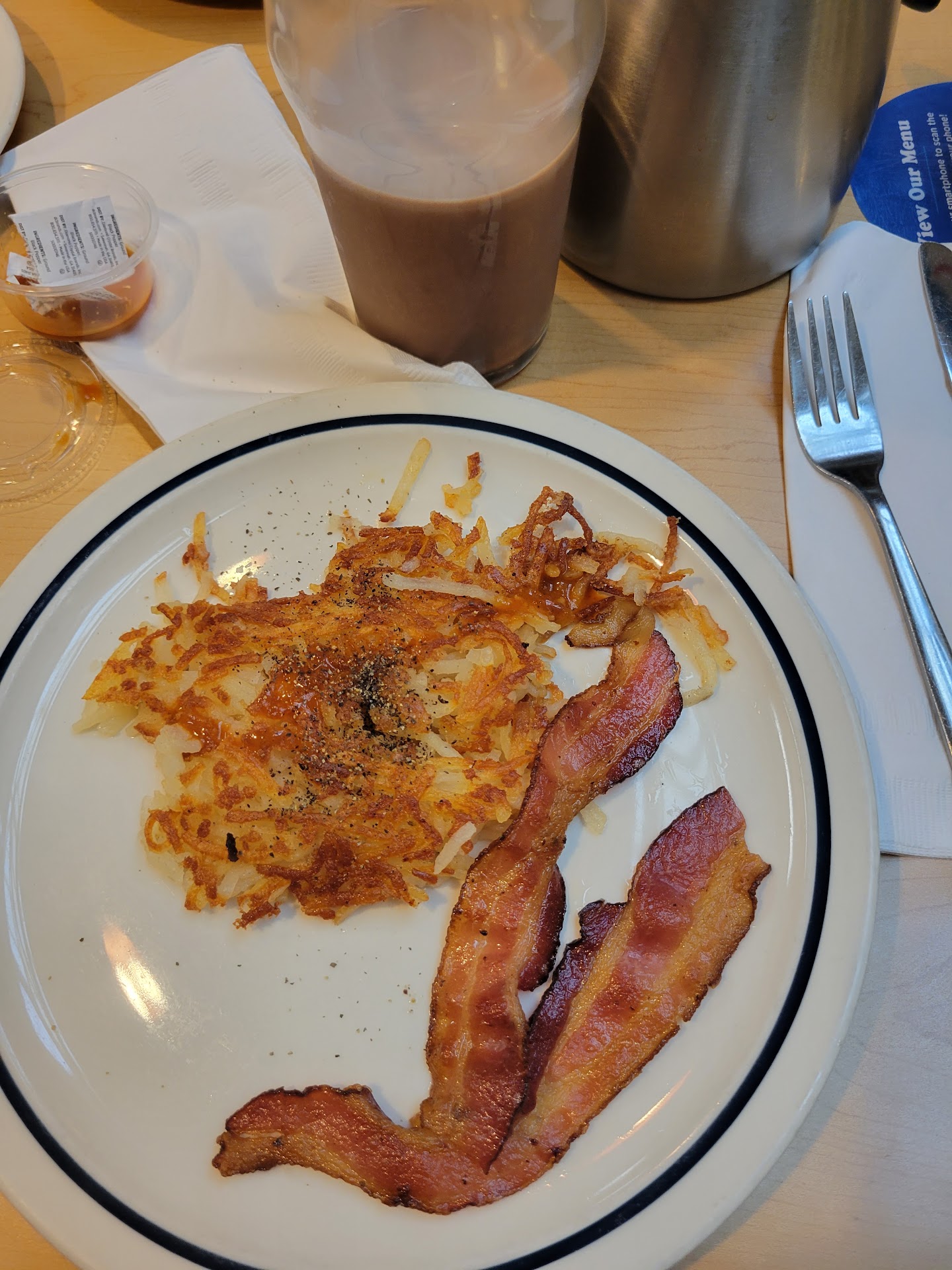 Read moreWe usually don't come to IHOP because we have had the worst experiences. We had not been to this establishment before. We were quickly seated by our server. He was very nice and cordial. He got our order and we got it quickly. There wasn't many people in at the time we were there. I got the senior rise and shine. My husband got just and omelette which I guess came with 2 pancakes. My eggs were good. My hash browns were overcooked outside and mushy on the inside. I could make mashed potatoes. Gave my dog the potatoes. Husband said there was Velveeta cheese on his omelette. He doesn't care for fake cheese. He ate it anyway. We took his pancakes home. I was still hungry so I ate the pancakes when we got home. I'm diabetic and that raised my glucose so high I had to take a nap. Yes, I went into a food coma.