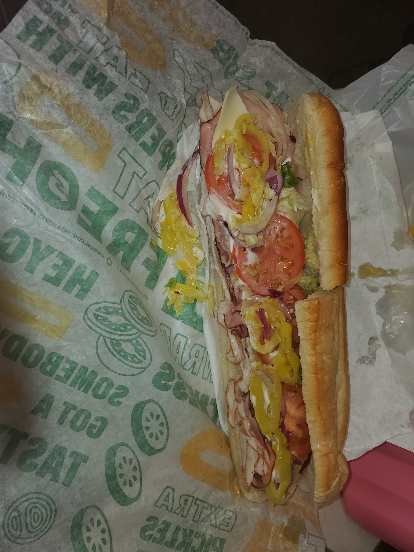 Read moreI ordered two toasted foot longs on the app on October 11th 2024 and when I picked them up they were barely room temperature, and it looked like whoever made and packaged them had squeezed them as tight as possible making them rock hard. The worker was also not wearing any subway attire and a spideran hat and I honestly don't know if he works there or if he just walked behind the counter. Will not order...