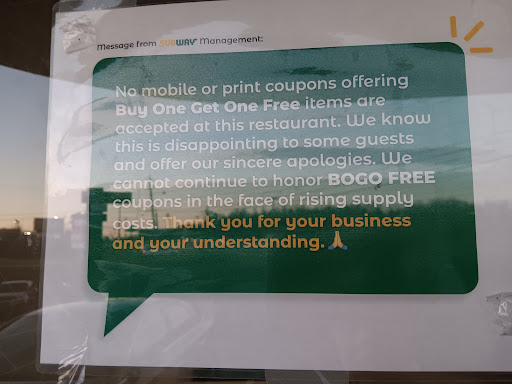 Read moreUpdate: since it's been awhile I decided to try this location again. The girl working yesterday was really nice. Had everything we wanted. She was fast and friendly. Might only go in the day time before 5 or 6 pm seems to be when the nice people are there. ......................................................................... I've went three 3 times. Just to give them the benefit of the doubt. 1st time I went there... me and wife both got sandwiches toasted.... they were both cold. 2nd time me, wife, and our friend ordered.... they messed them all up. 3rd time I ordered through the app.... for me and my wife.... the app said my order was ready. We got in the car went to go get it.... sat there for 20minutes after the time it said it was ready. Waited for one person to make 5 people's orders. Because the second the one thought it better to clean the floors then to help clear the lobby. Plus they didn't have all of order. So they had to refund half of it. Will not go this...